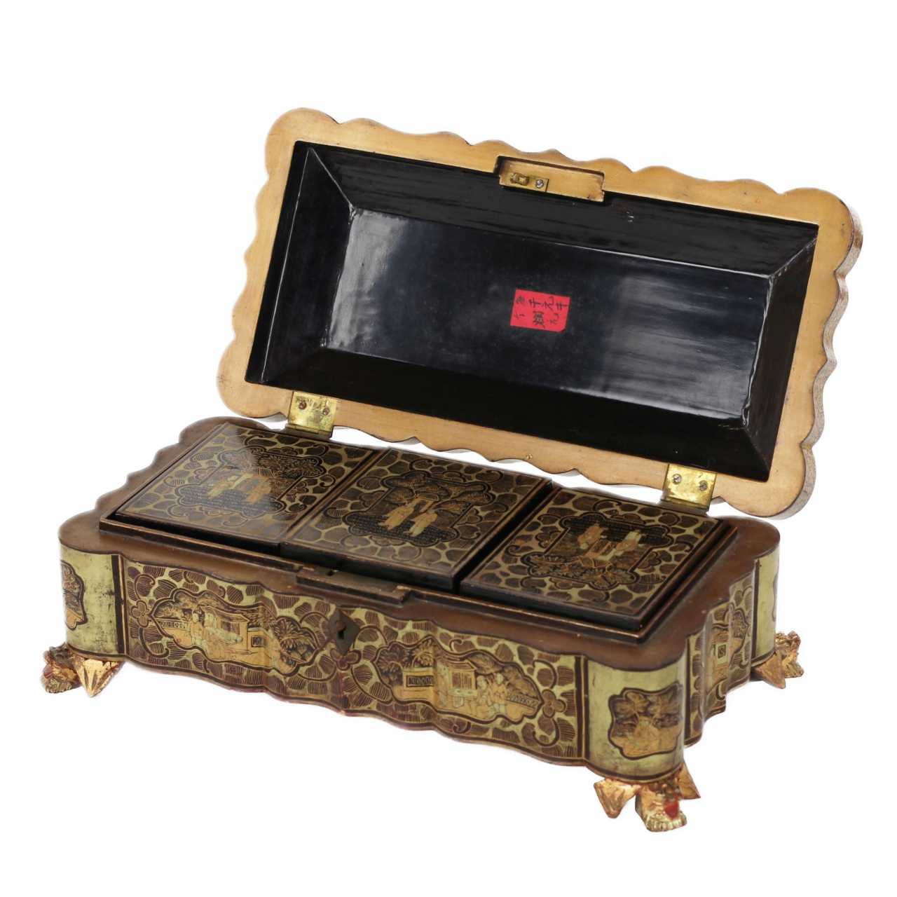 Шкатулка для игры покрытая черным с золотом лаком. Китай Кантон 19 век. Pearl Chinoiserie 19th century г.