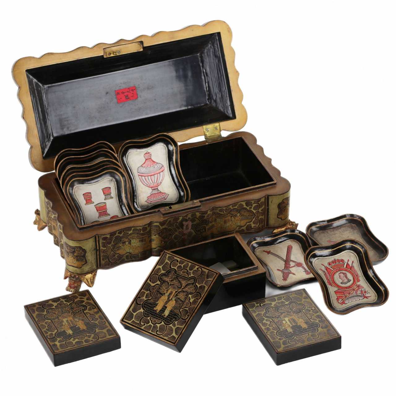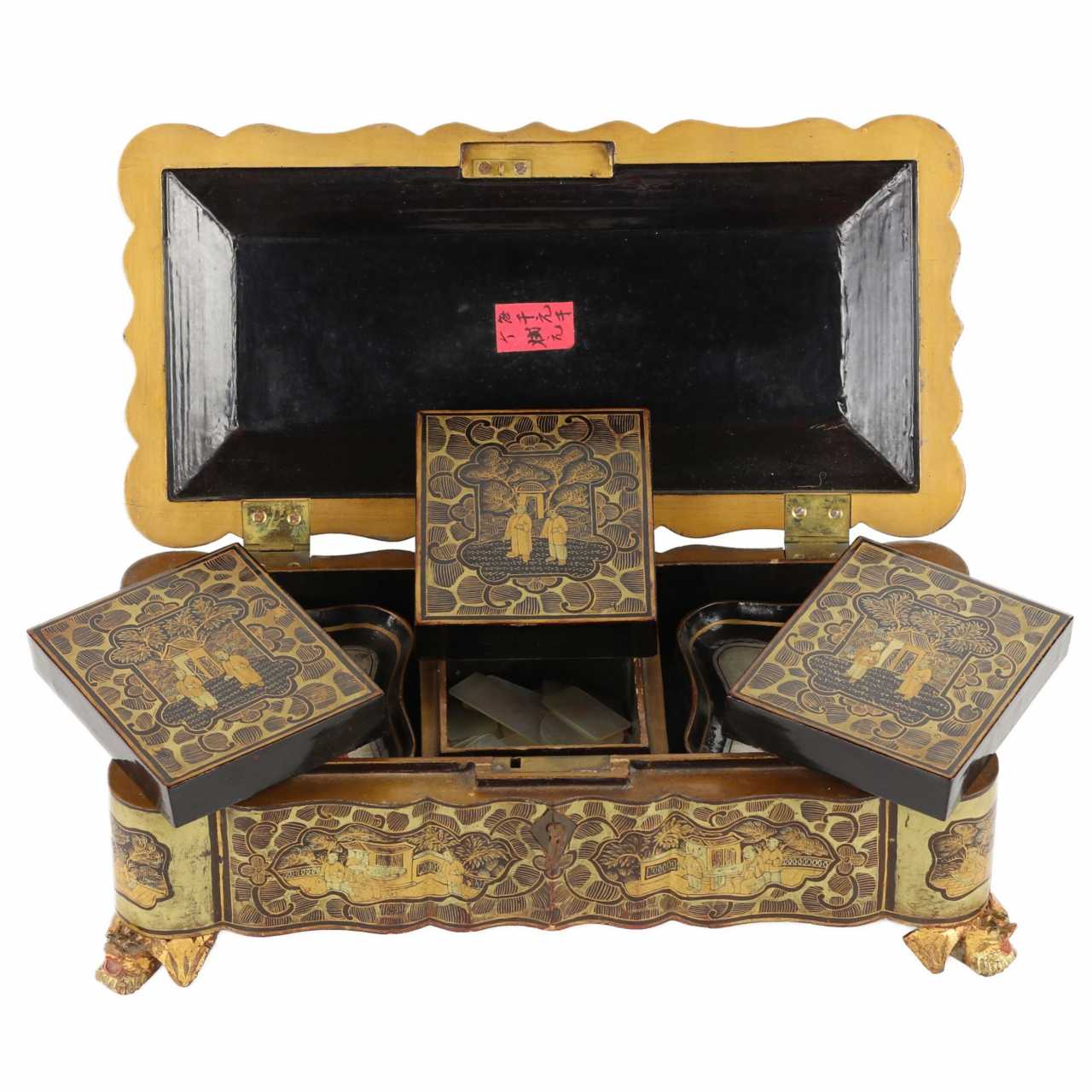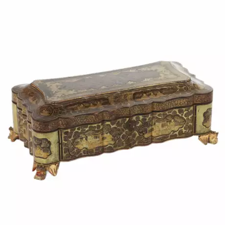 Шкатулка для игры покрытая черным с золотом лаком. Китай Кантон 19 век. Pearl Chinoiserie 19th century г.