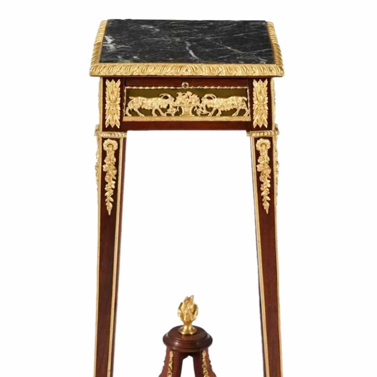 Французкая консоль рубежа 19-20 веков красного дерева и золоченой бронзы, в стиле ФРАНСУА ЛИНКЕ. Высота: 87,5 см. Столешница 35 x 35 см. Сюжетной основой декора являются козы, поедающие виноград из корзин. А также, богатые фактурой и рисунком, пояса и виньетки.
