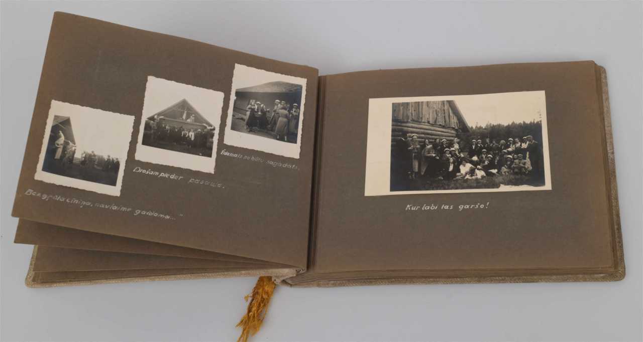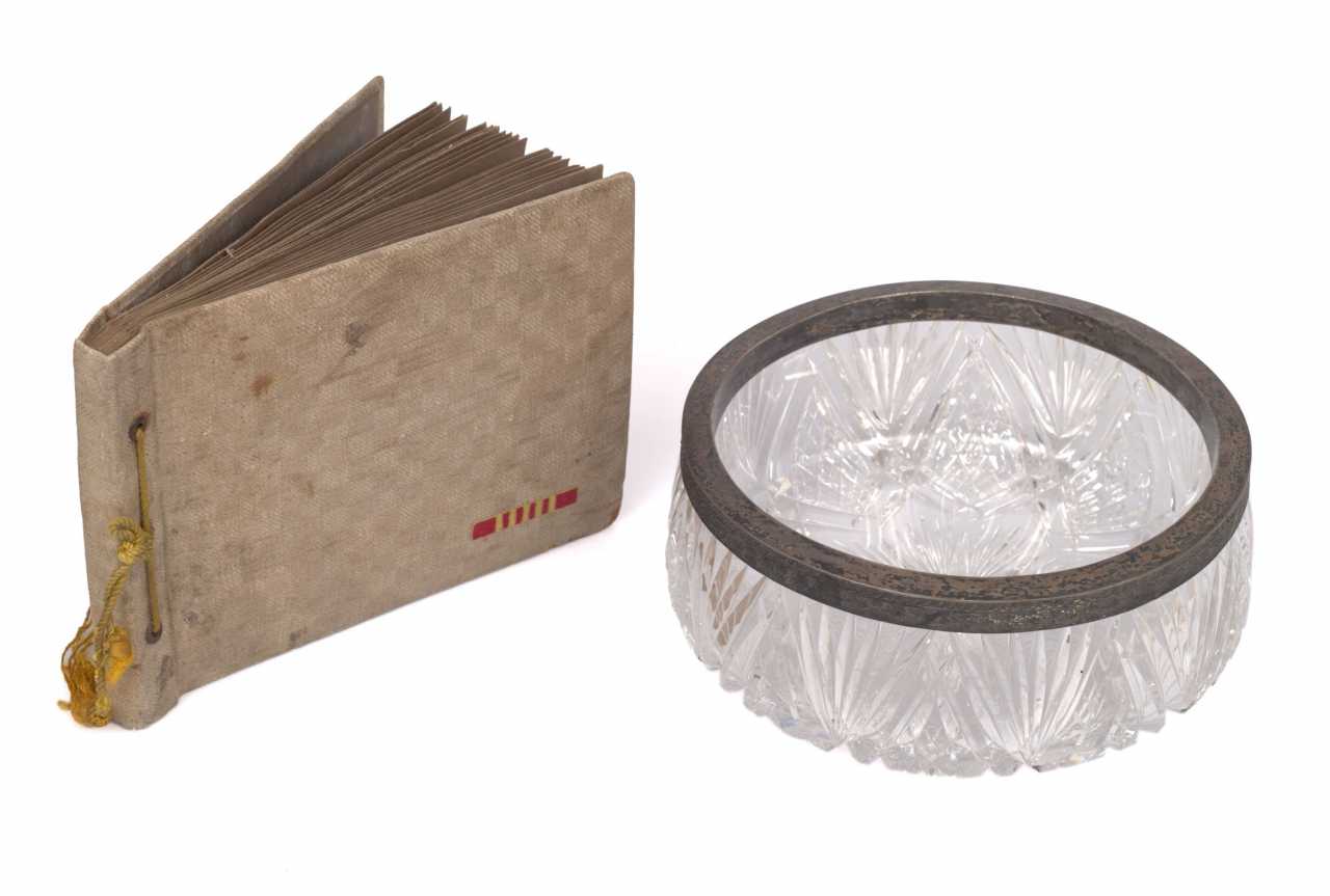 1929. Латвия. Хрусталь (изготовлен на Ильгюциемском стекольном заводе), серебро, проба 875, инициалы OV Надпись серебряной массой LH и LU studentu vietne Latviete 10. VIII. 29. rnПолный альбом Latviete&39;s joys and sadies с фотографиями членов Latviete corporation, включая праздники и другие события. 70 фотографий. Тарелка 10x22,6 см. Альбом 18x24,2 см