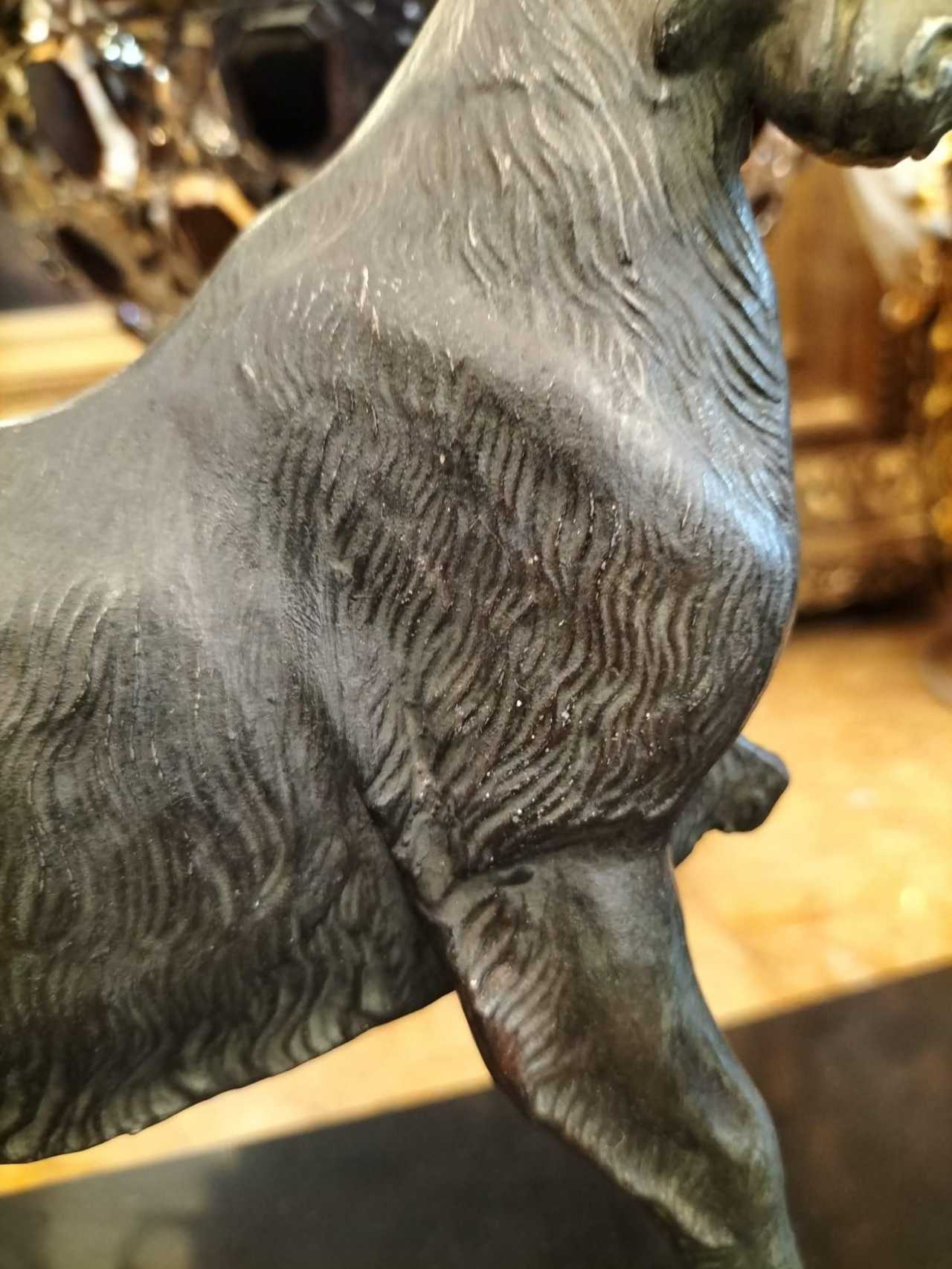 We are excited to present you with this bronze sculpture of two goats engaged in a dynamic stance. The goat on the right side is rearing up on its hind limbs, with its front legs raised, while the other goat remains grounded yet engaged as it appears to be pushing back. The craftsmanship is of high quality, with greatly realistic detailing of the animals, capturing the texture of their fur and musculature with great precision. The interaction between the two animals reflects energy and movement, symbolising competition, vitality, and natural instincts.From an artistic perspective, the statue balances movement and tension, with the raised and lowered positions of the goats creating contrast . The dark bronze material gives it a classical feel, while the onyx base adds to its significance as a piece to be displayed and pleasing to the eye.This piece would beautifully enhance the decor of any home, whether for a collector of animal sculptures or simply a lover of cute farm animals, such as goats.