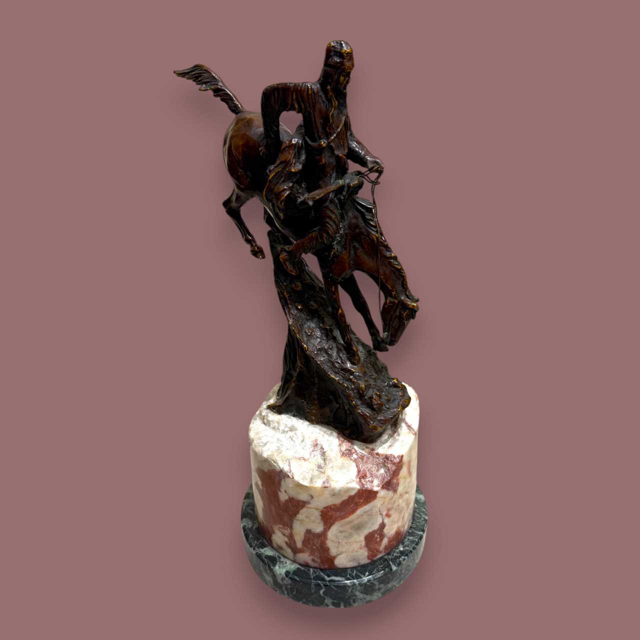 This striking bronze sculpture, attributed to the legendary American artist Frederic Remington, captures the essence of the rugged frontier spirit with breathtaking motion and anatomical precision. Titled “The Mountain Man,” the piece depicts a daring horseman and his mount descending a treacherous slope, the reins taut and tension palpable. This dramatic composition — one of Remington’s most iconic subjects — epitomizes the peril and tenacity of life in the American West.Remingtons mastery in rendering movement, detail, and raw emotion is on full display, from the horse’s poised limbs to the rider’s focused intensity. The sculpture is mounted on a beautifully striated red-and-white marble pedestal, set atop a darker marble plinth that provides striking visual contrast and stability.A collector’s piece of historical and artistic importance, this work is a tribute to the frontier mythos Remington helped define and immortalize. Ideal for connoisseurs of Western Americana, fine bronze sculpture, or late 19th to early 20th century American art.