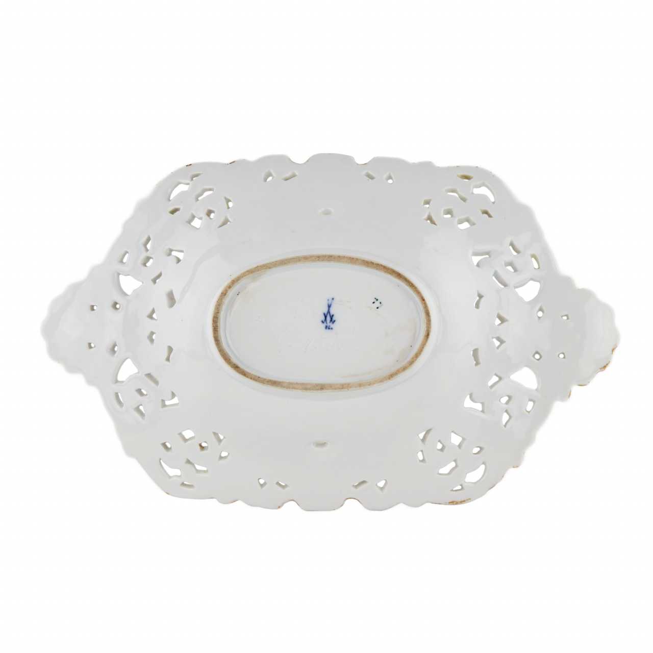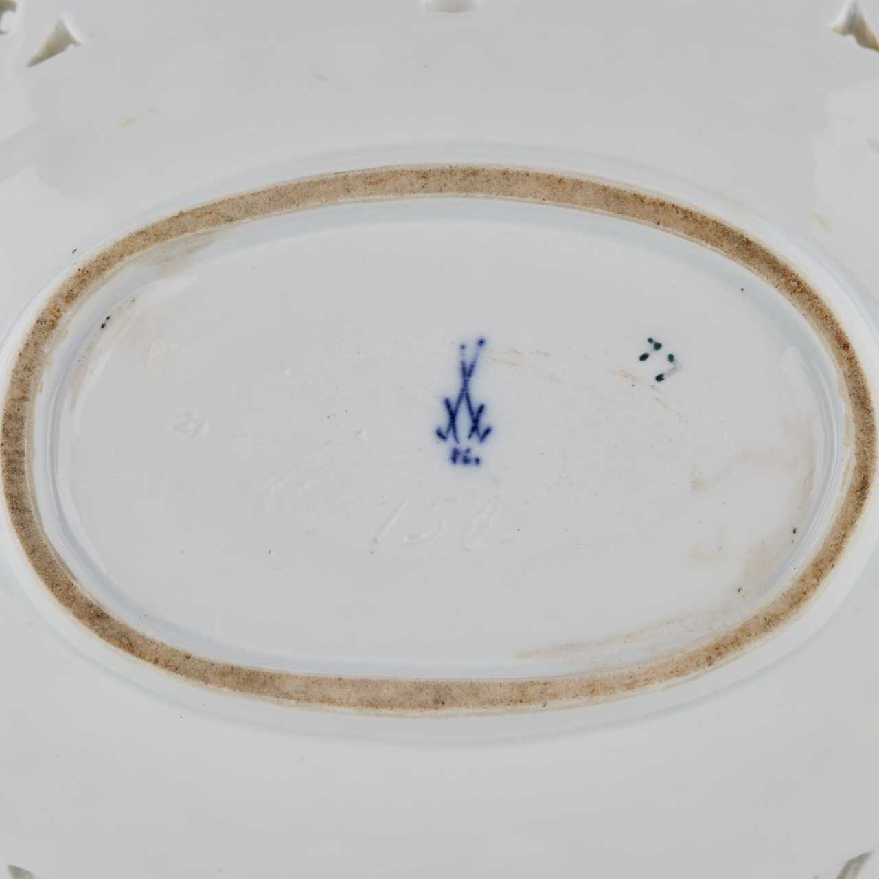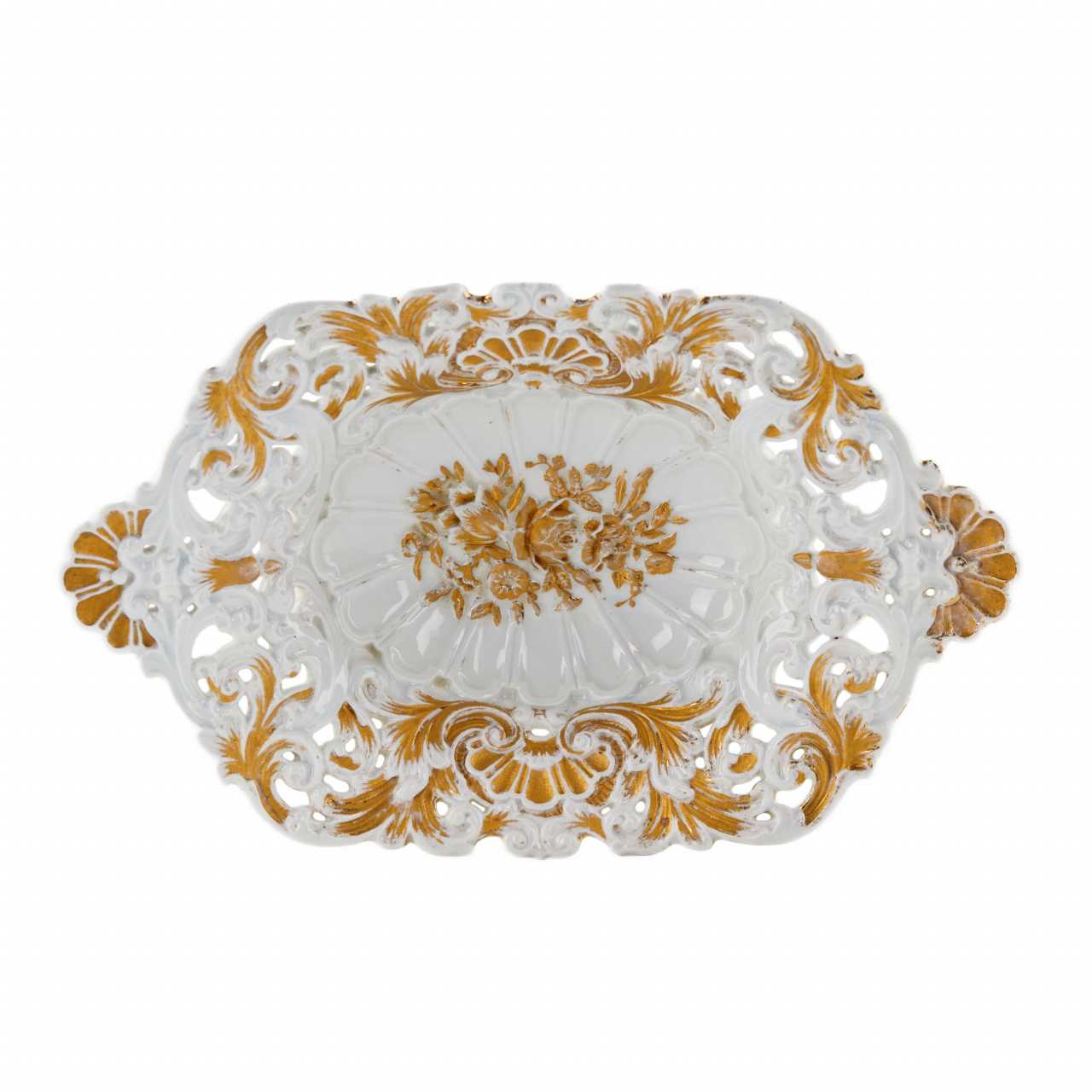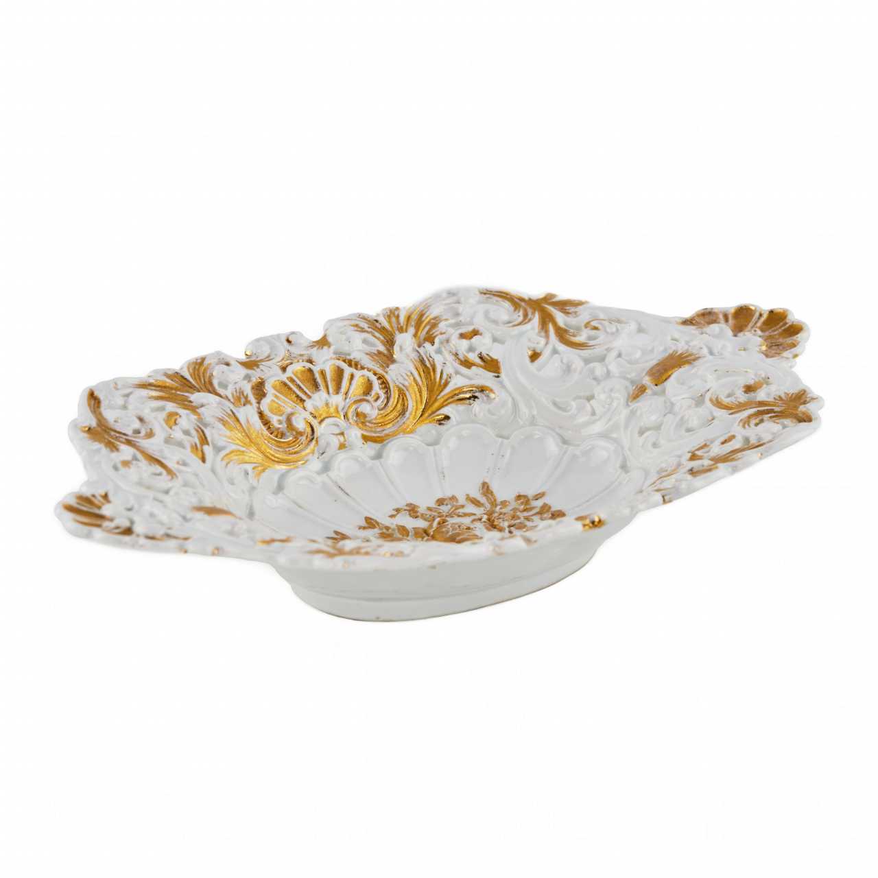 Большая фарфоровая сухарница Мейсенской мануфактуры. Большая сухарница из фарфора, декорированная рельефным, прорезным (по борту блюда) и позолоченным цветочно-лиственным узором в стиле барокко (раковины, завитки). С ажурным краем по борту. В центральной части предмета расположена позолоченная рельефная цветочная композиция.Германия, Мейсен. Конец ХIХ -начало ХХ века. Фарфор, фактурная обработка, золочение. Состояние коллекционное, без сколов. Следы бытования - частичная потертость позолоты.Длина - 35.6 см; ширина - 21.7 см. Вес - 877 гр. Марка мануфактуры Мейсена, рисованная кобальтом, «скрещенные мечи» и под ней цифры (?) с точкой «86.» (?), подглазурная. Номер фарфоровой модели по прейскуранту - 150 (в тесте)