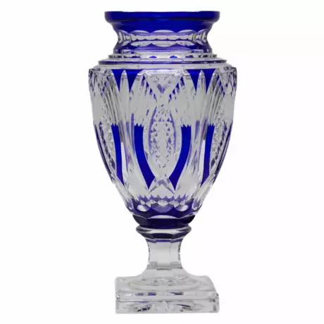 Большая, амфорообразная ваза Юпитер. Цветного хрусталя, бельгийской фабрики Saint-Lambert. Красивый и заметный предмет интерьера. Выполнен в духе Богемского хрусталя эпохи Бидермайера. С готическим, заостренным к низу, туловом, ступенчатой, широкой горловиной и бело-синей гаммой хрусталя. В сегментах декора используются геометрические мотивы овалов и колосящихся злаков. Весь ансамбль держится на сверкающей мощи граненой ножки и квадрате основания. Высота: 40 см. 1970 годы.