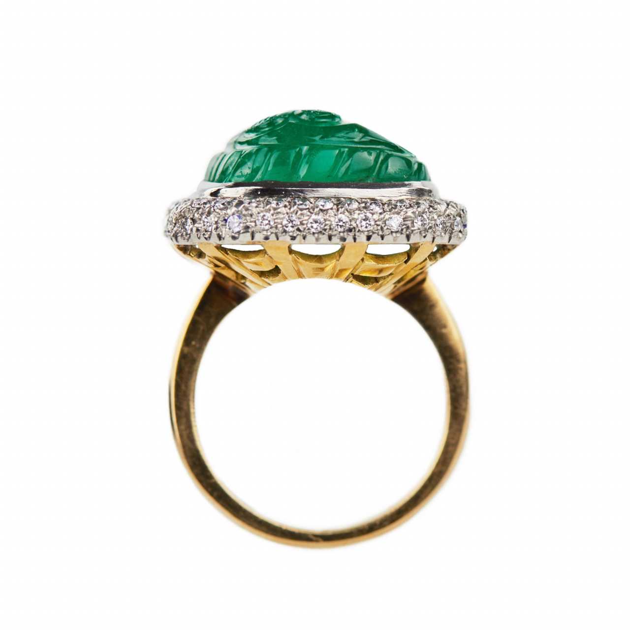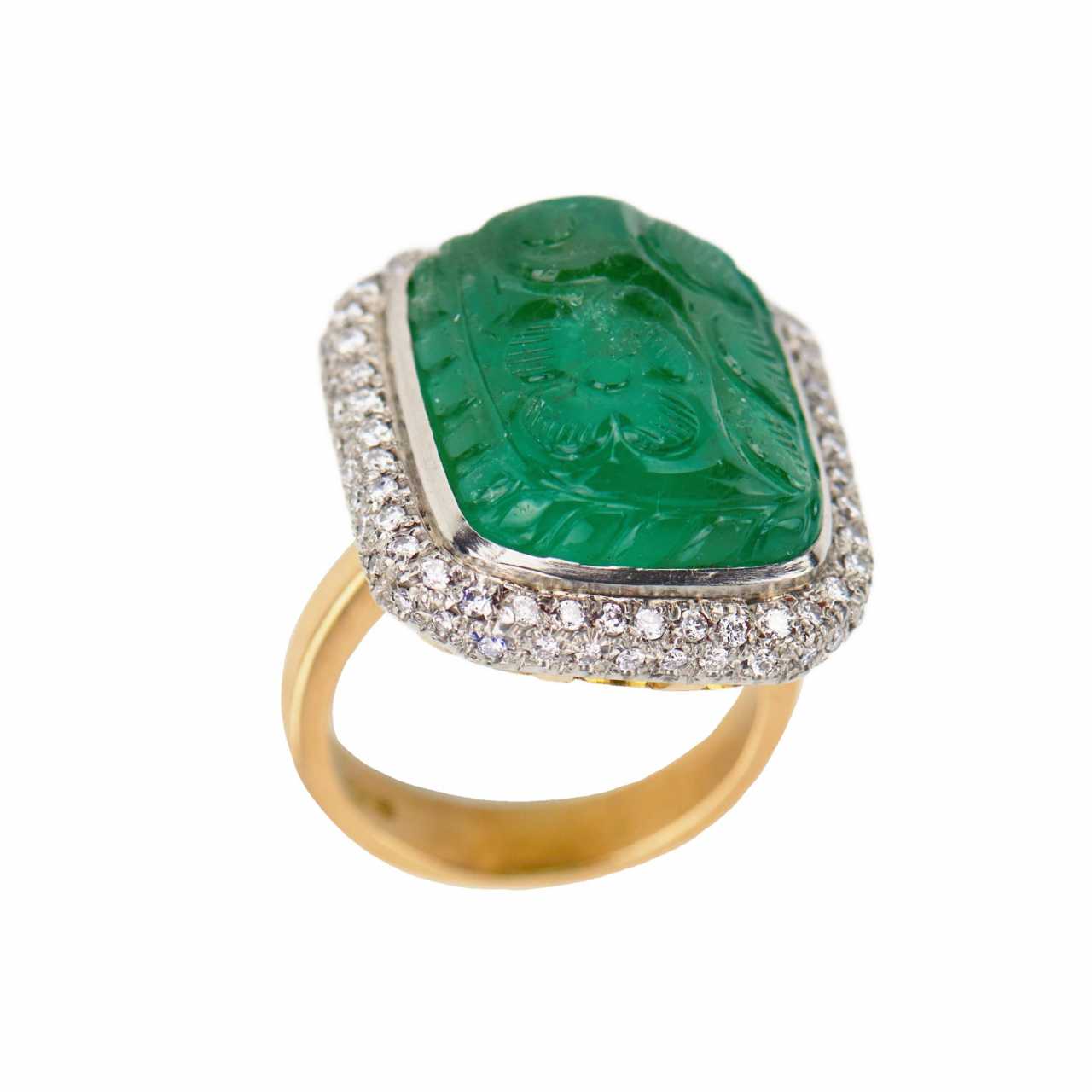 Внушительное золотое кольцо-перстень с изумрудом и бриллиантами. Золото 18к, изумруд 18 карат, с гравировкой цветочного побега. 80 бриллиантов 0,64 карат. G-H. VS-SI. Размер кольца: 17. Вес: 17,63 гр. Сертификат латвийской пробирной палаты: 3-9-8662021.