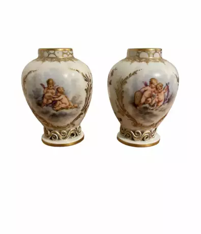 Пара ваз с путти от Königliche Porzellan-Manufaktur (KPM). С мотивами путти, цветочными украшениями и позолотой. Обе вазы имеют штампы и оттиски снизу. В хорошем состоянии без видимых повреждений. Состояние видно на прилагаемых фотографиях. Вазы имеют высоту около 10 см и диаметр 7,5 см.