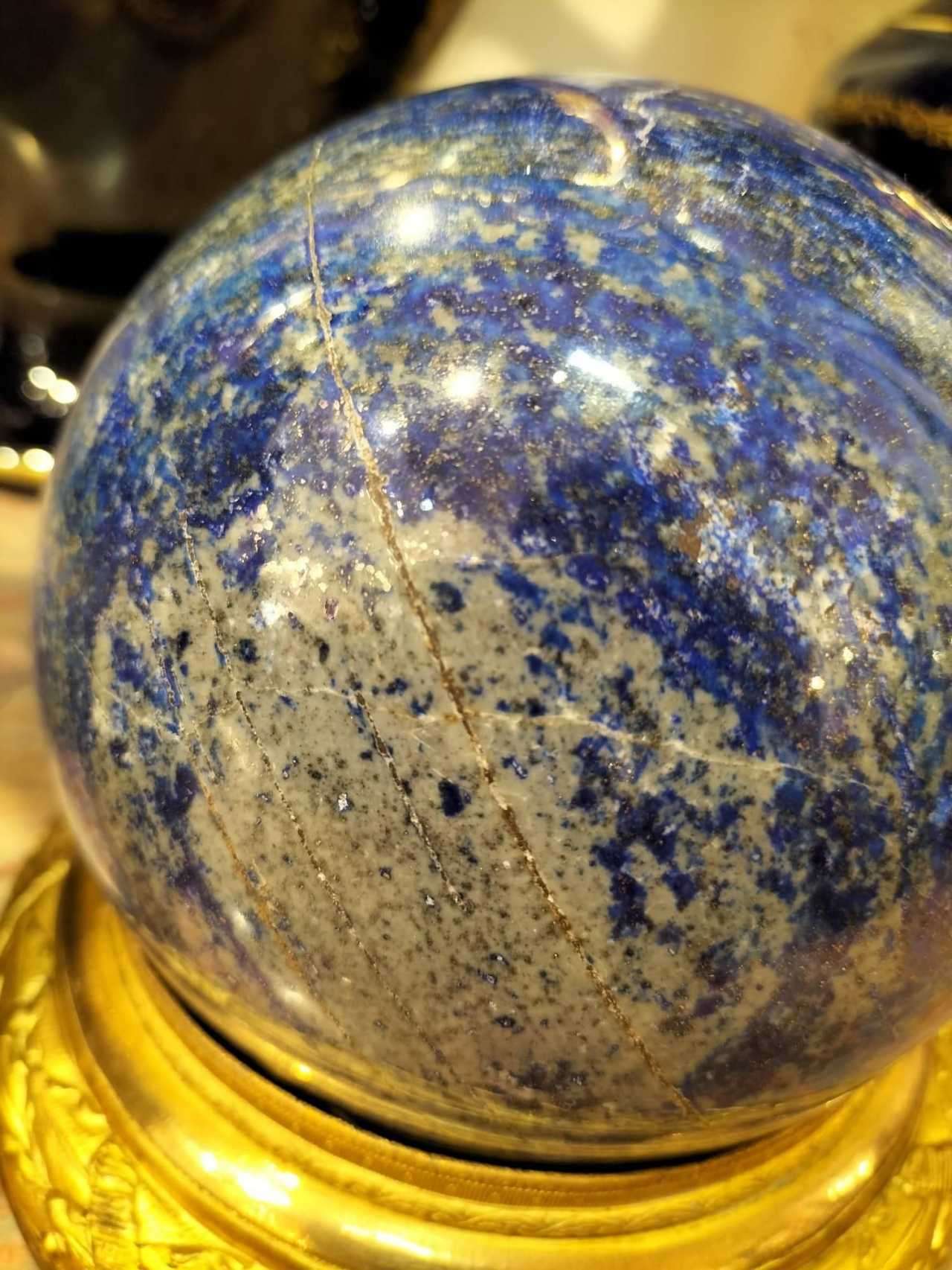 We are delighted to present you with this incredible polished sphere of Lapis Lazuli, a deep blue metamorphic rock often used in jewelry and decoration.The sphere displays a vibrant mix of blue hues, interspersed with veins of white calcite and specks of golden pyrite, which are characteristic of high-quality Lapis Lazuli.The stone is mounted on a 19th century bronze gilded base.The natural beauty and unique patterning of this stone makes it a striking decorative piece that would enhance any living space.