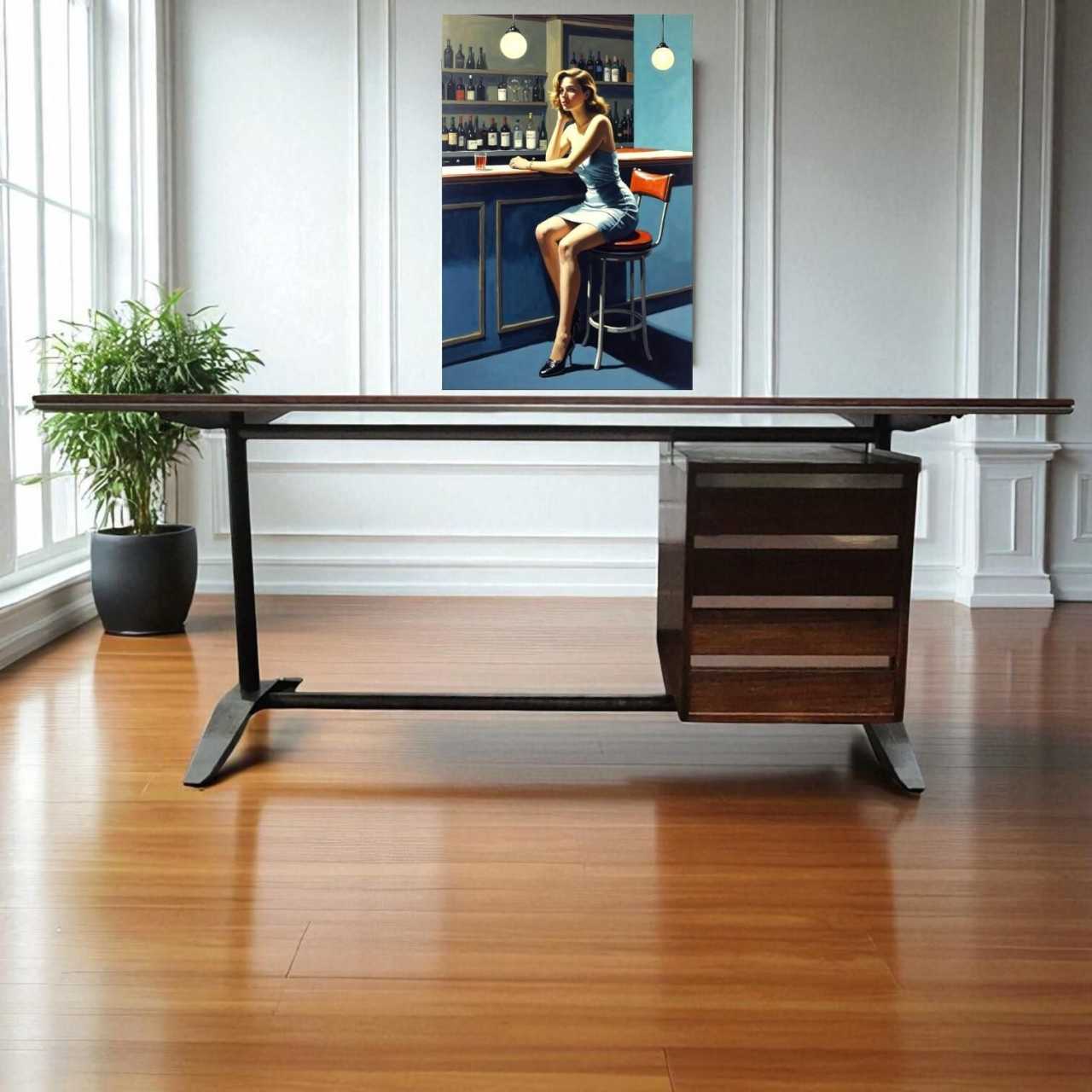 An iconic piece of Italian modernist design, this Tecniform desk was created in 1958 by the visionary duo Alberto Rosselli and Gio Ponti for Arflex. Embodying the elegant innovation of the post-war Italian modernist movement, the desk highlights Ponti’s refined architectural sensibilities combined with Rosselli’s sharp sense of industrial functionality.The design centers around a suspended drawer unit with four walnut-veneered drawers, floating beneath a broad, ultra-minimalist top. The base rests on a chromed steel frame with splayed legs, evoking the futuristic aesthetic of 1950s Italy. Its functional layout makes it ideal for both residential and professional use.This piece not only reflects the ingenuity of its creators, but also stands as a timeless testament to an era defined by bold experimentation and refined craftsmanship. A true museum-worthy collectible, it is a rare find for discerning connoisseurs of Italian modern design.