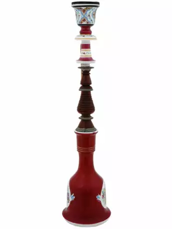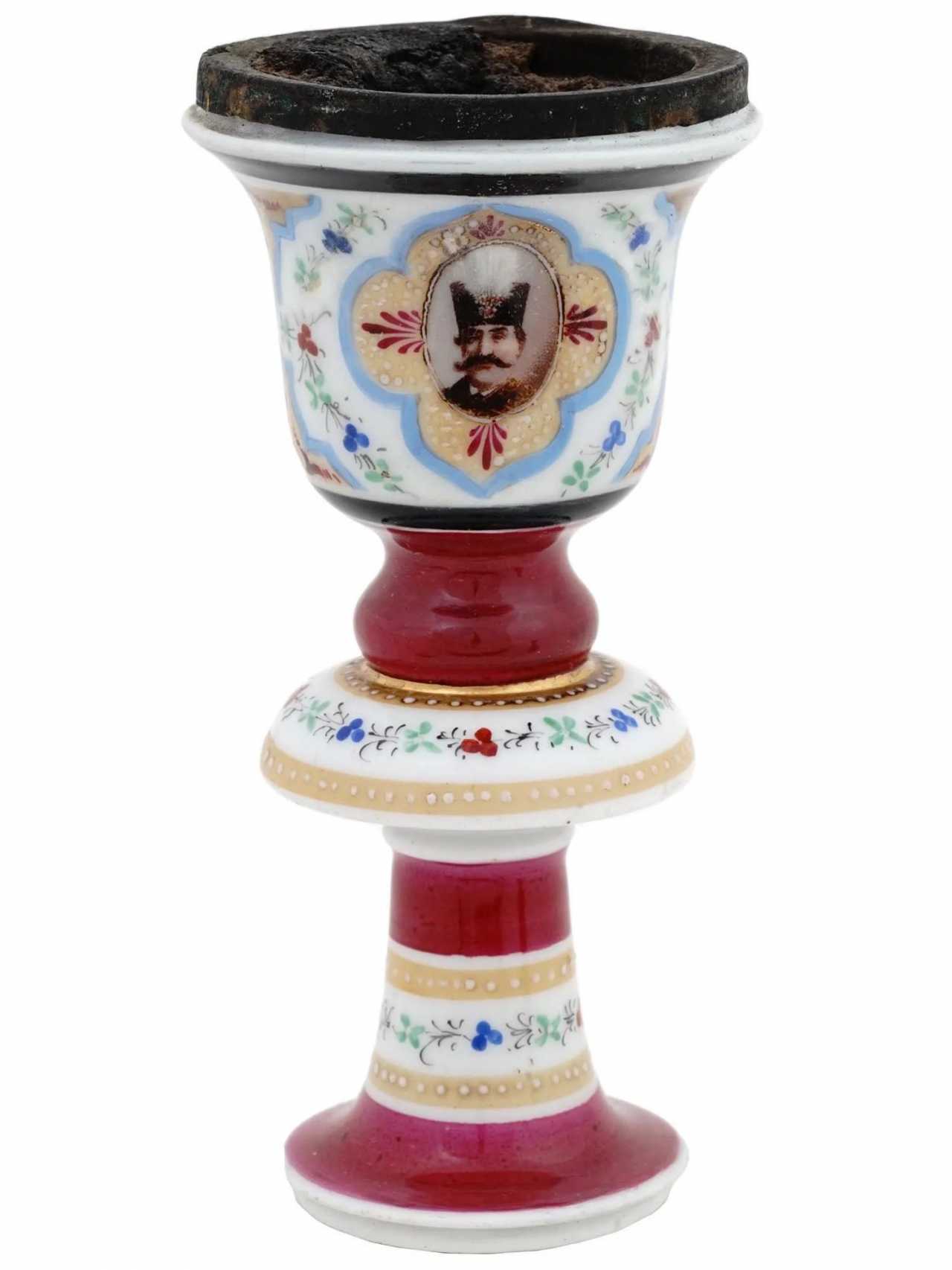 Уникальный русский фарфоровый кальян выполненный на фабрике Кузнецова в Дулево . Фарфоровый кальян ручной росписи с деревянной трубкой, состоит из центральной водяной камеры, ножки с мундштуком и чаши для ароматизированного табака, украшенны медальонами с портретами знатных персидских вельмож. Яркие цвета и тщательная проработка деталей росписи демонстрирует высокое мастерство художников фабрики Кузнецова. Роспись, деколь с подрисовкой. Надглазурное клеймо: Фабрика Кузнецова в Дулево, арабская вязь для предметов изготовленных на экспорт. Конец 19 века. Высота: 58 см.