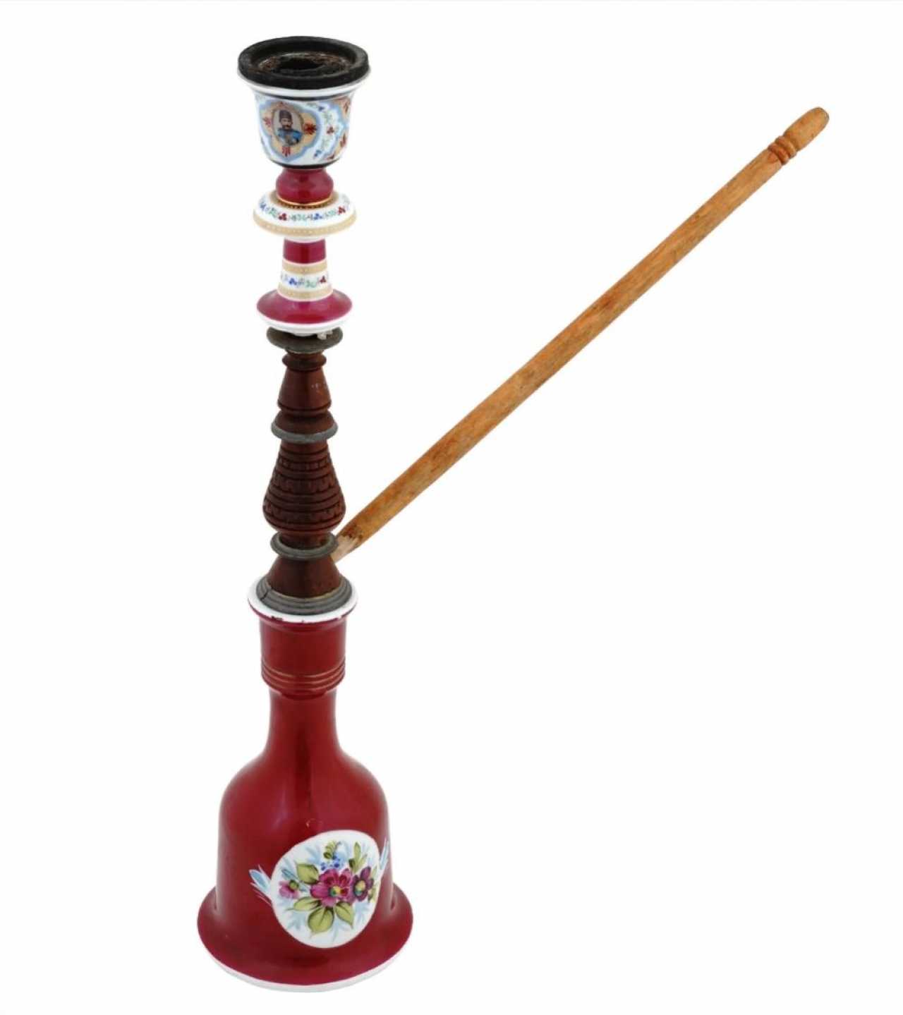 Уникальный русский фарфоровый кальян выполненный на фабрике Кузнецова в Дулево . Фарфоровый кальян ручной росписи с деревянной трубкой, состоит из центральной водяной камеры, ножки с мундштуком и чаши для ароматизированного табака, украшенны медальонами с портретами знатных персидских вельмож. Яркие цвета и тщательная проработка деталей росписи демонстрирует высокое мастерство художников фабрики Кузнецова. Роспись, деколь с подрисовкой. Надглазурное клеймо: Фабрика Кузнецова в Дулево, арабская вязь для предметов изготовленных на экспорт. Конец 19 века. Высота: 58 см.
