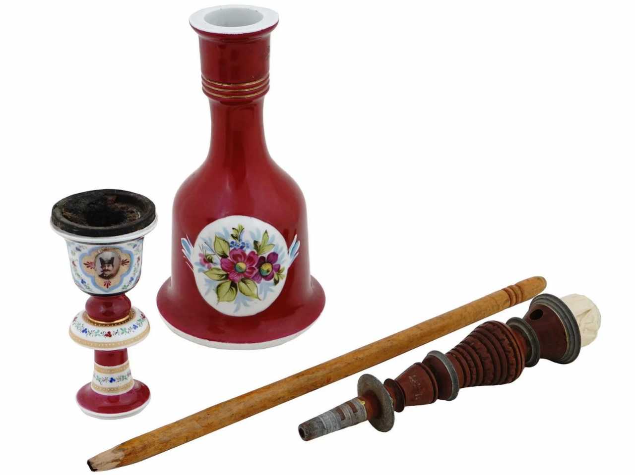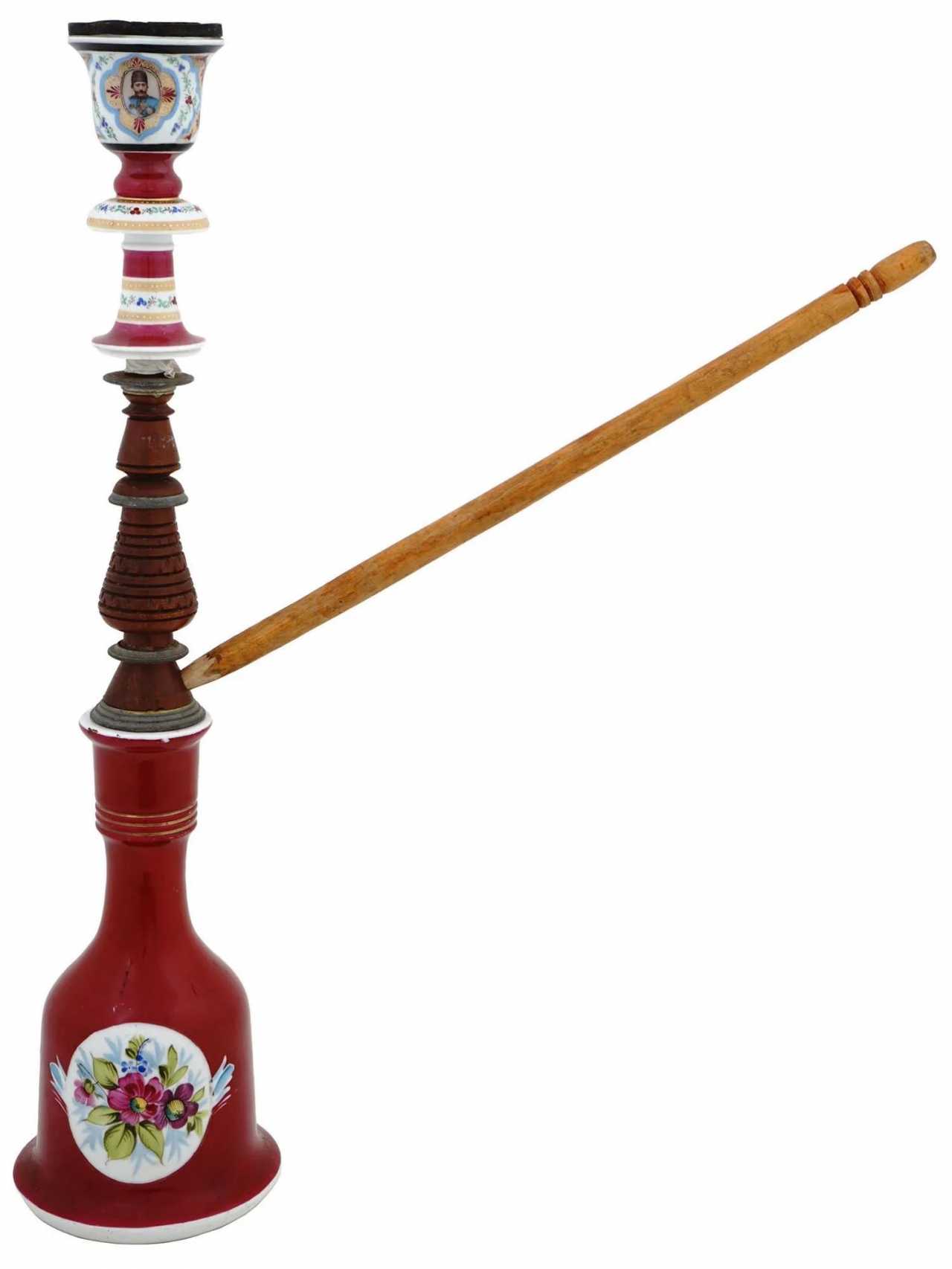 Уникальный русский фарфоровый кальян выполненный на фабрике Кузнецова в Дулево . Фарфоровый кальян ручной росписи с деревянной трубкой, состоит из центральной водяной камеры, ножки с мундштуком и чаши для ароматизированного табака, украшенны медальонами с портретами знатных персидских вельмож. Яркие цвета и тщательная проработка деталей росписи демонстрирует высокое мастерство художников фабрики Кузнецова. Роспись, деколь с подрисовкой. Надглазурное клеймо: Фабрика Кузнецова в Дулево, арабская вязь для предметов изготовленных на экспорт. Конец 19 века. Высота: 58 см.