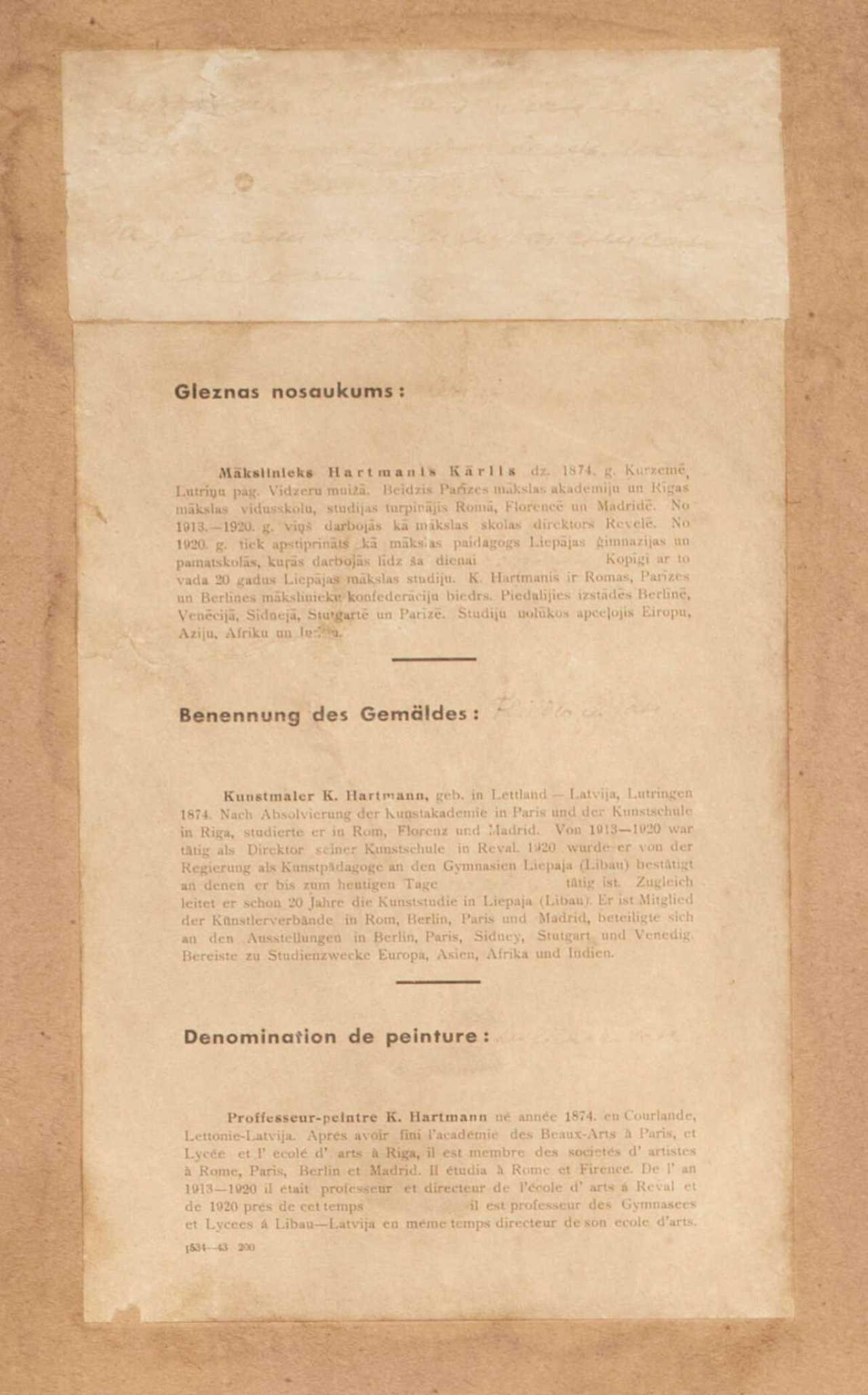 1943. Картон, масло. 100x70 см Карлис Хартманис.