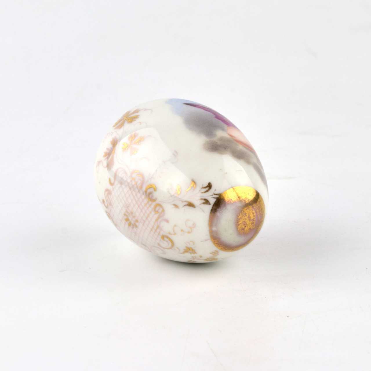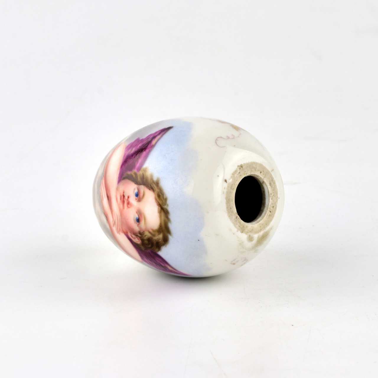 Фарфоровое пасхальное яйцо с расписным Рафаэлевым ангелочком, золотой виньеткой и гирляндами декора. 1900 е года. Предположительно Императорский Фарфоровый завод. В.- 6 см.