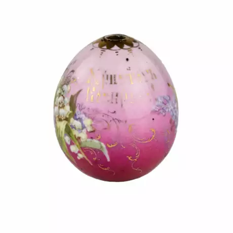 Расписное пасхальное яйцо из фарфора с изображением цветущих ландышей и сирени. С милым и деликатными золотом роккайлей, а также с титлом Христос воскресе. Переходы розовых тонов оттеняют нежный голубой рисунок сирени и мерцание золота. Золото, деколь с подрисовкой. Частное фарфоровое производство России рубежа 19-20 веков.