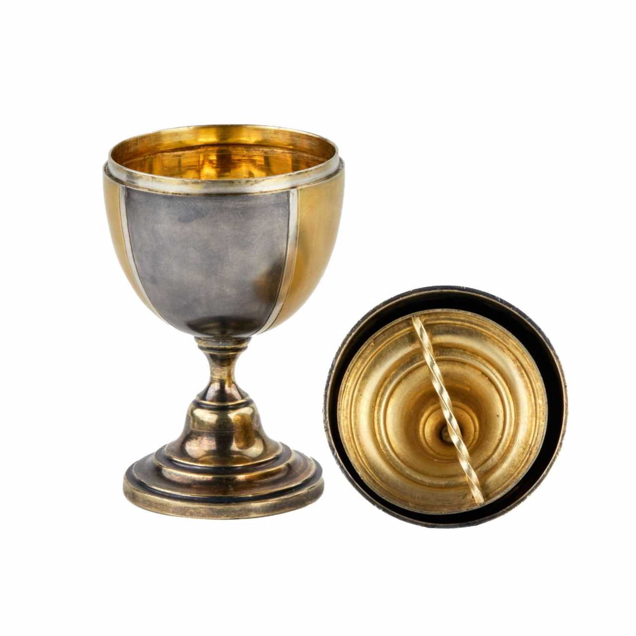 Яйцо пашотница из серебра с золочением. Обиходный предмет оригинально включает в один пасхальный объем - пару составных подставок для яиц. Лапидарное золочение долек позволяет комбинировать узор, в том числе и в шахматном порядке, перекликаясь с мотивами итальянского возрождения. Эрик Коллин (Erik August Kollin). На внутренних сферах яйца клейма: ЭК. 84 с гербом Петербурга в овале. Эрик Коллин один из мастеров Фаберже. Общий вес: 109 гр.