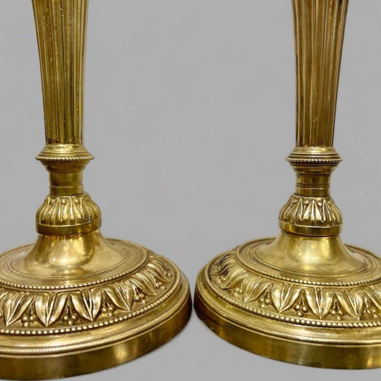 This unique pair of 19th-century candlesticks in gilt bronze from the Bourbon Restoration period in France (1814 – 1830) features fancy palmette decorations and fluted stems.They stand at a height of 31 cm and feature a plate with a diameter of 15 cm, making them perfect for enhancing the look of any table or dresser as a centrepiece.