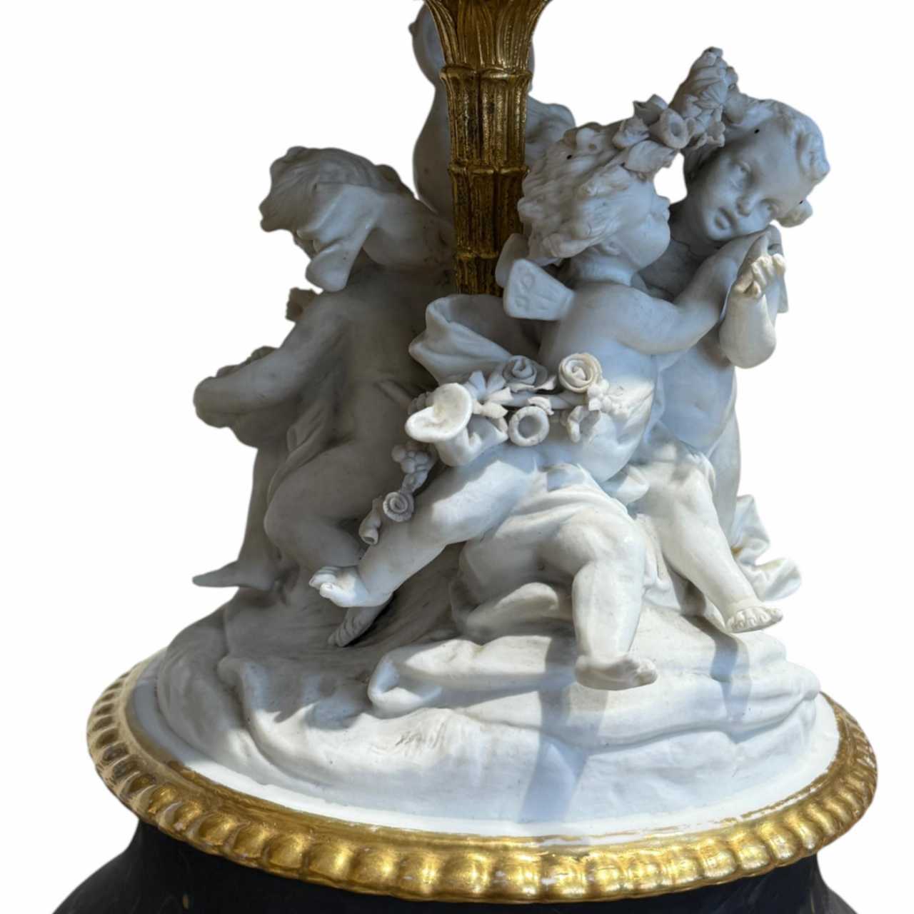 An opulent and finely crafted 19th-century French centerpiece, this piece epitomizes the elegance and artistic sophistication of the Louis XVI revival period. The openwork basket is fashioned from porcelain, delicately hand-painted and adorned with rich gilding, supported by a neoclassical stem featuring an intricately sculpted group of three cherubs in bisque porcelain. The cherubs—representing playful innocence and love—are rendered with extraordinary detail, their flowing forms lending a sense of movement and grace.The piece rests on a rounded, black porcelain base with elegant gilded decoration and scalloped edges, adding dramatic contrast and visual weight to the composition.Perfect as a centerpiece or decorative object on a mantel or console, this work embodies the refined taste of 19th-century French decorative arts, seamlessly blending porcelain artistry with the sculptural beauty of gilt bronze.