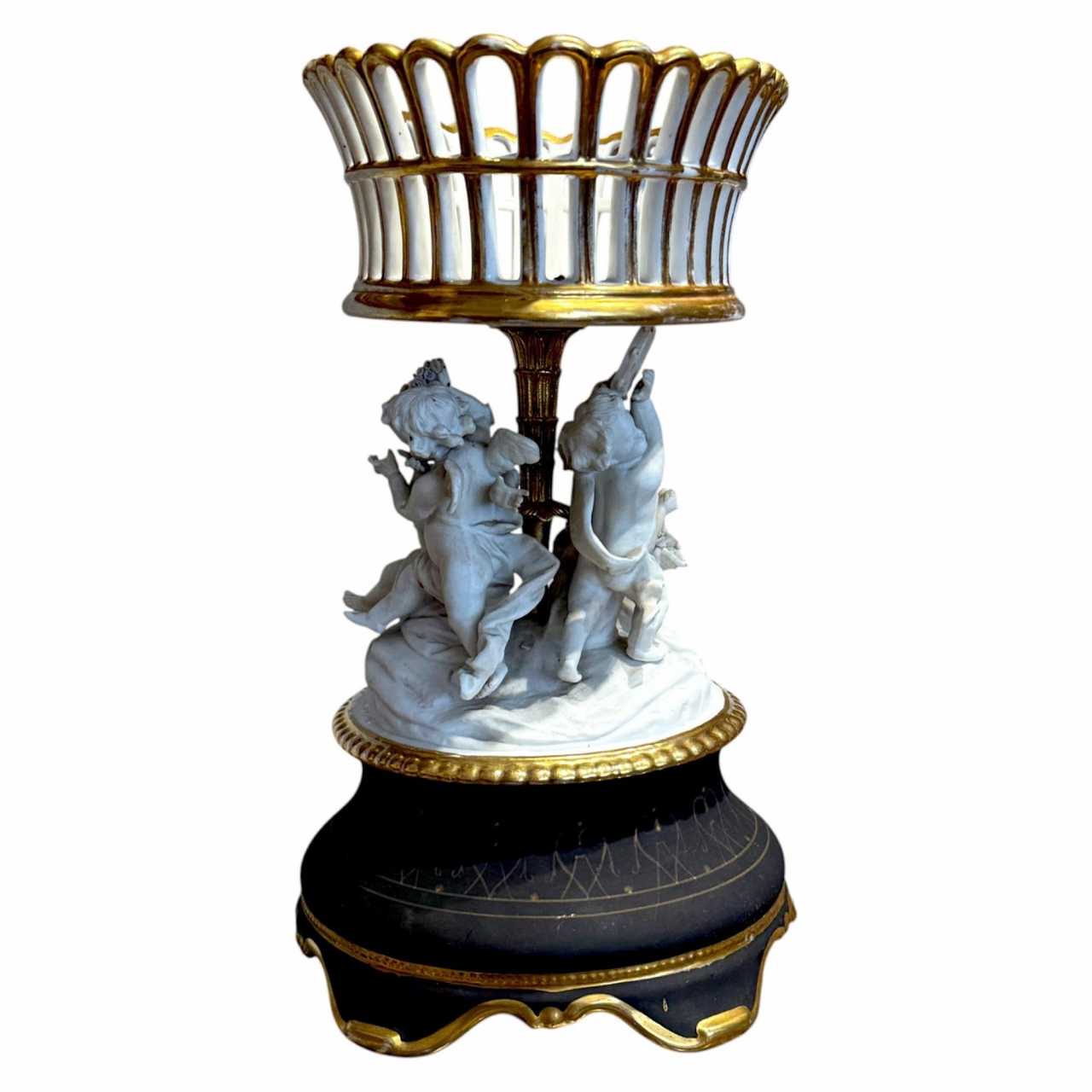 An opulent and finely crafted 19th-century French centerpiece, this piece epitomizes the elegance and artistic sophistication of the Louis XVI revival period. The openwork basket is fashioned from porcelain, delicately hand-painted and adorned with rich gilding, supported by a neoclassical stem featuring an intricately sculpted group of three cherubs in bisque porcelain. The cherubs—representing playful innocence and love—are rendered with extraordinary detail, their flowing forms lending a sense of movement and grace.The piece rests on a rounded, black porcelain base with elegant gilded decoration and scalloped edges, adding dramatic contrast and visual weight to the composition.Perfect as a centerpiece or decorative object on a mantel or console, this work embodies the refined taste of 19th-century French decorative arts, seamlessly blending porcelain artistry with the sculptural beauty of gilt bronze.