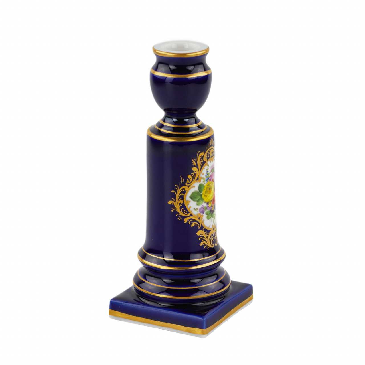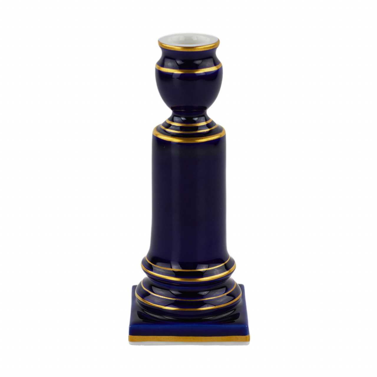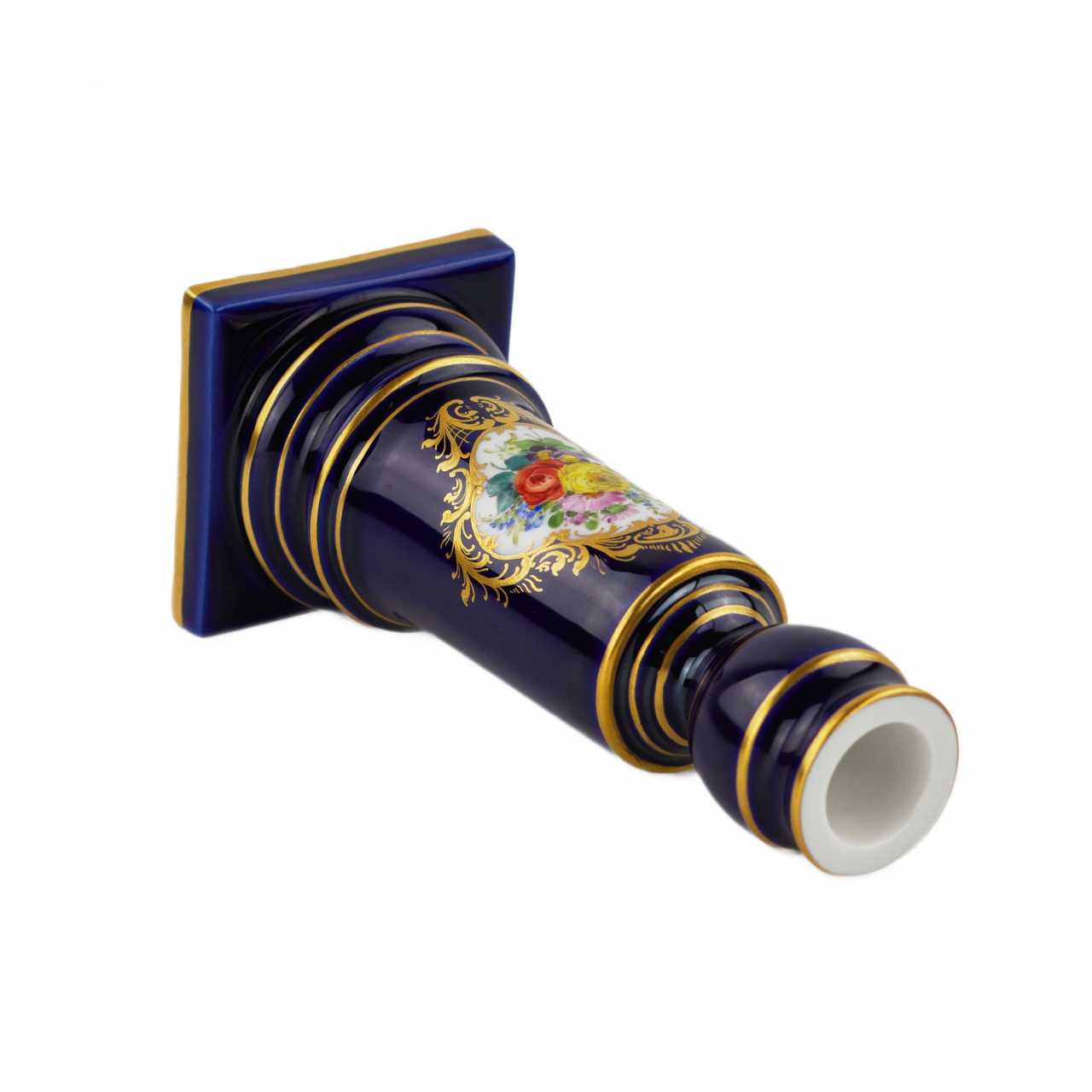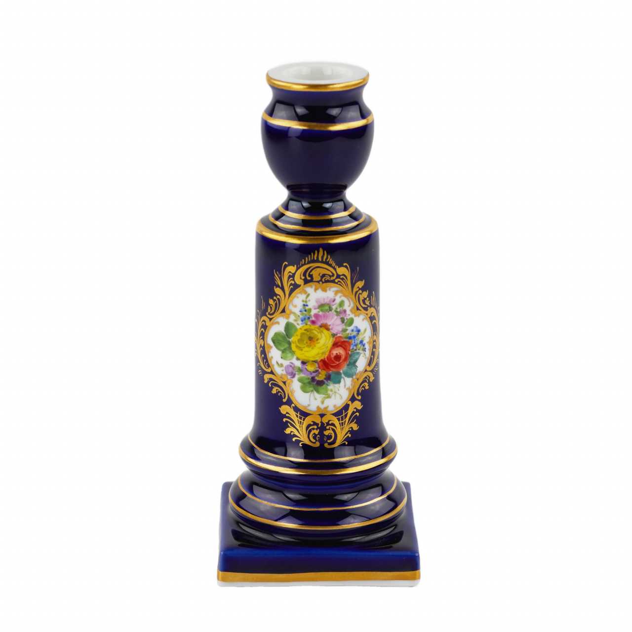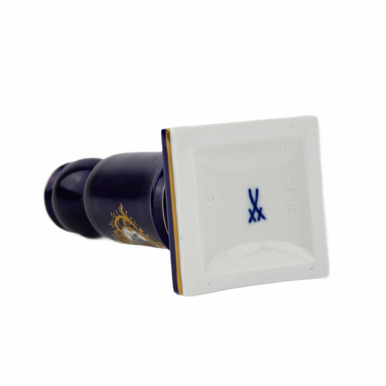 Маленький подсвечник Мейсенской фарфоровой мануфактуры. Маленький подсвечник в форме колонны, цилиндрической формы, опирающейся на квадратный постамент. Подсвечник декорирован букетом цветов, на белом фоне, в резерве с золотой изящной рамкой. Цилиндрический ствол подсвечника, постамент и головка подсвечника декорированы золотыми полосками по периметру. Остальная поверхность подсвечника декорирована сплошной росписью кобальтом. Германия. Мейсен. ХХ век. Фарфор, подглазурное крытье кобальтом и надглазурная полихромная роспись. Золочение. Роспись трафаретная с изображением букета цветов, получившего наименование «мейсенский букет». Состояние отличное. Высота - 15.2 см, размер основания - 6.0х6.0 см. Стандартная производственная марка Мейсена. Марка мануфактуры представлена на дне предмета, рисованная кобальтом, подглазурная - «скрещенные мечи», Мейсен, ХХ век.