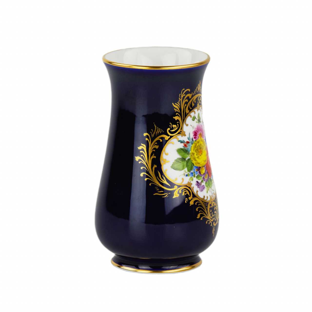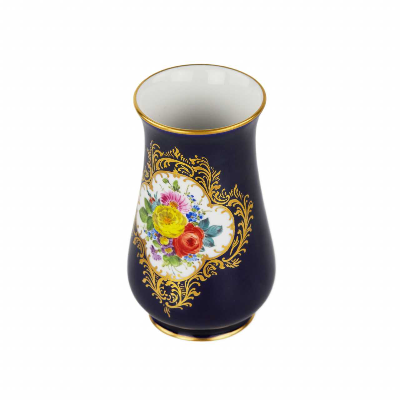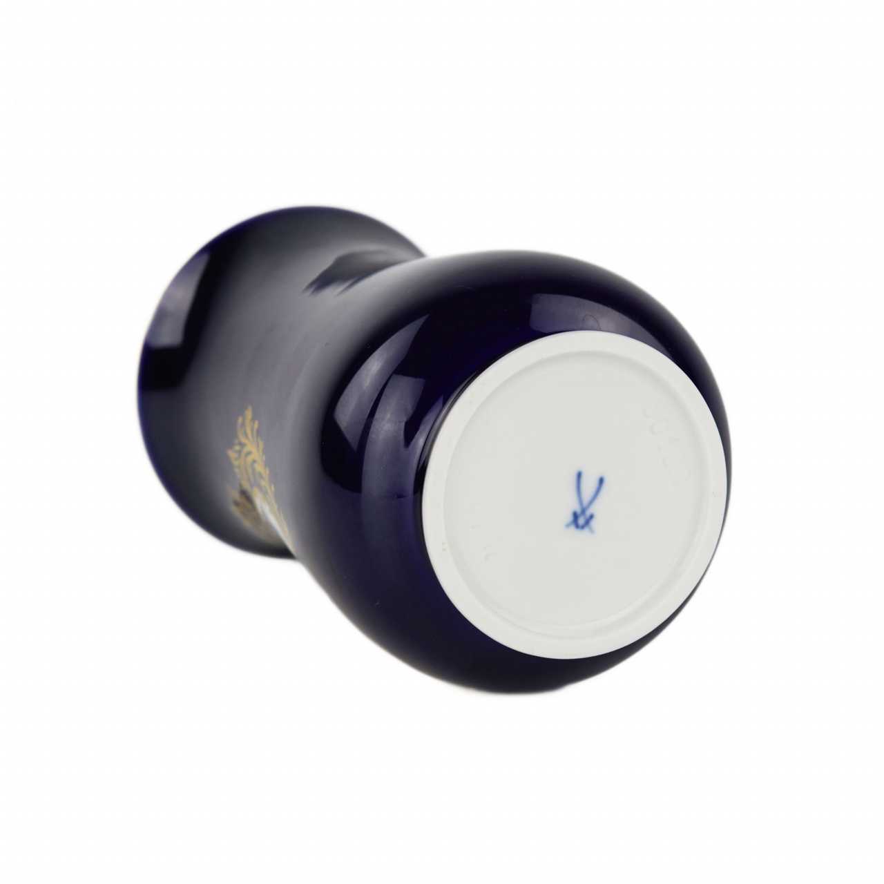 Маленькая ваза Мейсенской фарфоровой мануфактуры. Маленькая ваза круглой, в поперечном сечении, формы, с сужением по средней части тулова. Декорирована букетом цветов, на белом фоне, в резерве с золотой изящной рамкой. Остальная внешняя поверхность вазочки декорирована покрытием кобальтом. Верхняя кромка и у основания - ваза декорирована золотой полоской. Германия. Мейсен. ХХ век. Фарфор, подглазурное крытье кобальтом и надглазурная полихромная роспись. Золочение. Роспись трафаретная с изображением букета цветов, получившего наименование «мейсенский букет». Состояние отличное. Высота - 11 см, диаметр дна - 4,7 см, диаметр верхней кромки - 5.5 см, Максим. диаметр тулова - 6.8 см, вес - 140 гр. Стандартная производственная марка Мейсена. Марка мануфактуры представлена на дне предмета, рисованная кобальтом, подглазурная - «скрещенные мечи», Мейсен, ХХ век.