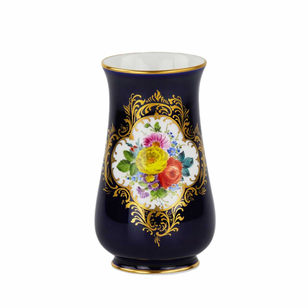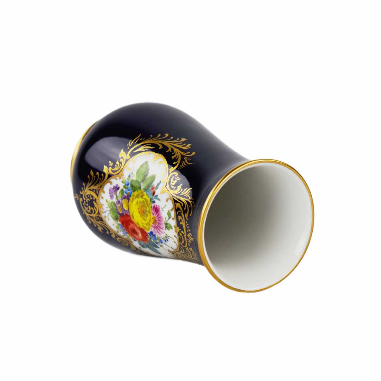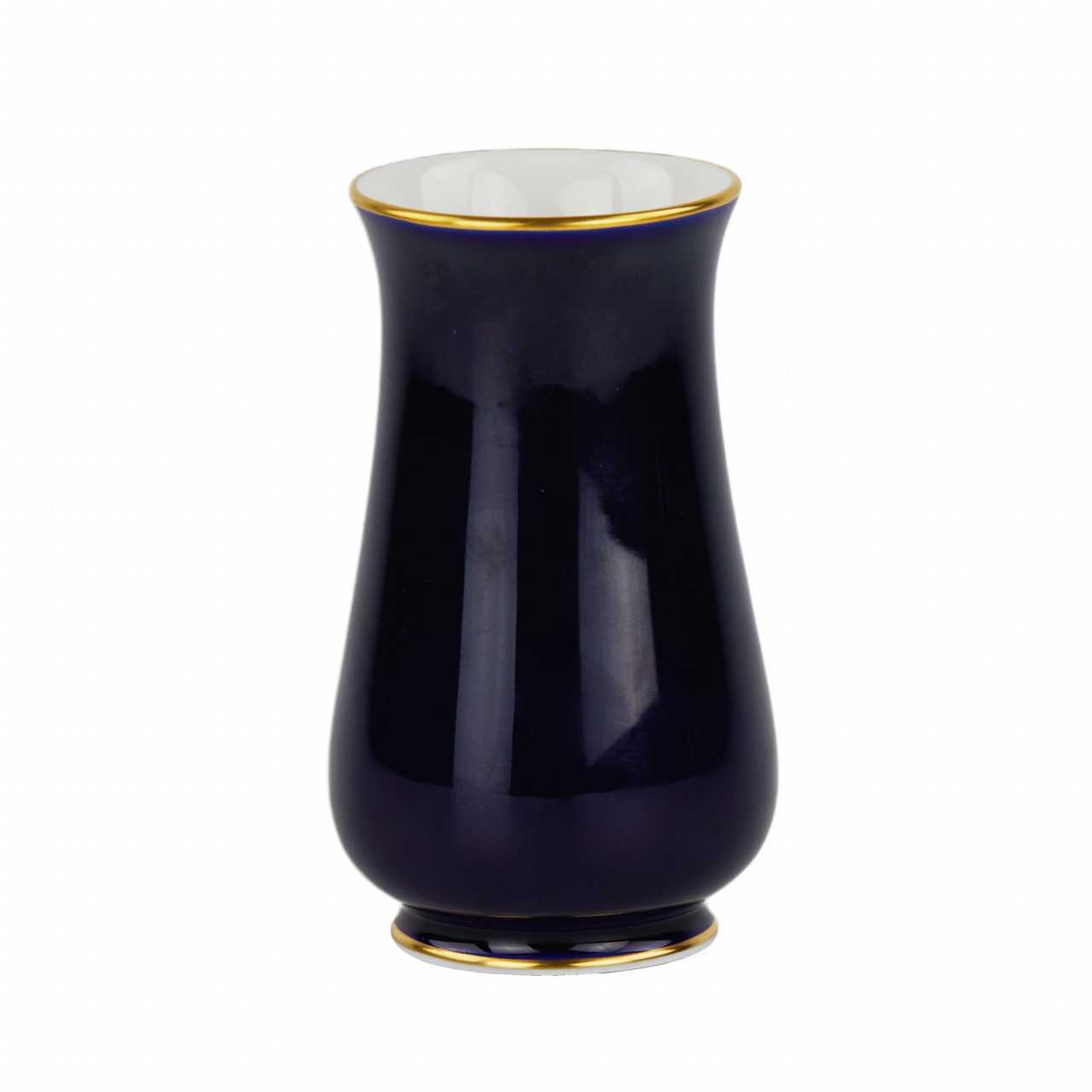 Маленькая ваза Мейсенской фарфоровой мануфактуры. Маленькая ваза круглой, в поперечном сечении, формы, с сужением по средней части тулова. Декорирована букетом цветов, на белом фоне, в резерве с золотой изящной рамкой. Остальная внешняя поверхность вазочки декорирована покрытием кобальтом. Верхняя кромка и у основания - ваза декорирована золотой полоской. Германия. Мейсен. ХХ век. Фарфор, подглазурное крытье кобальтом и надглазурная полихромная роспись. Золочение. Роспись трафаретная с изображением букета цветов, получившего наименование «мейсенский букет». Состояние отличное. Высота - 11 см, диаметр дна - 4,7 см, диаметр верхней кромки - 5.5 см, Максим. диаметр тулова - 6.8 см, вес - 140 гр. Стандартная производственная марка Мейсена. Марка мануфактуры представлена на дне предмета, рисованная кобальтом, подглазурная - «скрещенные мечи», Мейсен, ХХ век.