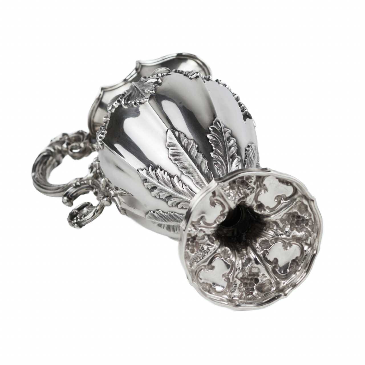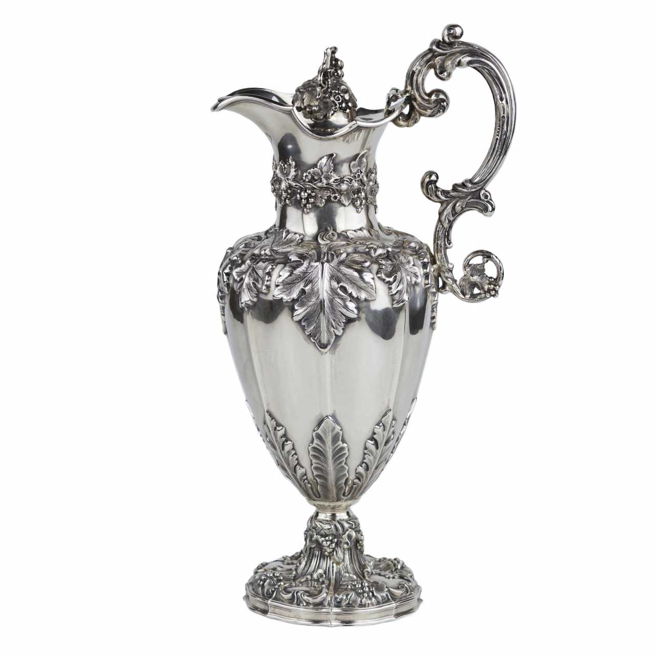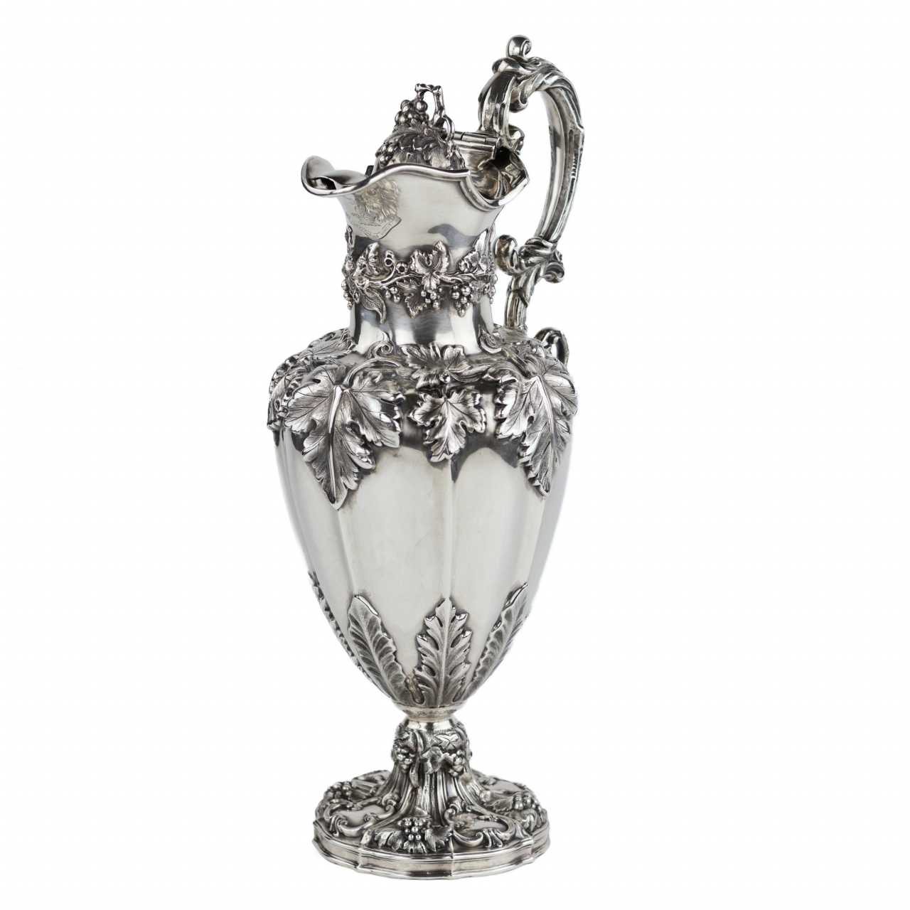 Изящный кувшин из стерлингового серебра 925 пробы, созданный в 1852 году в Шеффилде мастерской Henry Wilkinson & Co.. Тулово балясинной формы украшено литым растительным орнаментом в виде акантовых листьев, гроздьев винограда и лоз, характерных для викторианского декоративного языка середины XIX века. Рельефный носик украшен гравированным гербом с девизом «FORTITUDINE VINCIT» («Мужеством побеждает»). Шарнирная крышка завершена пластичной гроздью винограда. Ажурная ручка оформлена рокайльным орнаментом, основание массивное, с рельефной композицией из аканта и виноградных кистей.Клейма: На корпусе выбиты британские клейма: клеймо мастерской HW & Co; лев с короной (стерлинговое серебро); голова леопарда (Лондон); годовая литера «I» (1852); профиль королевы Виктории (обязательное клеймо после 1838 г.); корона. Дополнительные клейма мастерской и декоративные штампы расположены в орнаменте.Размеры: Высота: 32 см; ширина: 13 см; глубина: 17 см.Вес: 764 г.Состояние: Отличное коллекционное состояние. Серебро без деформаций, утрат или следов реставрации. Полировка ровная, клейма отчётливо читаемы.Происхождение: Шеффилд, Великобритания. Мастерская Henry Wilkinson & Co., 1852 год.