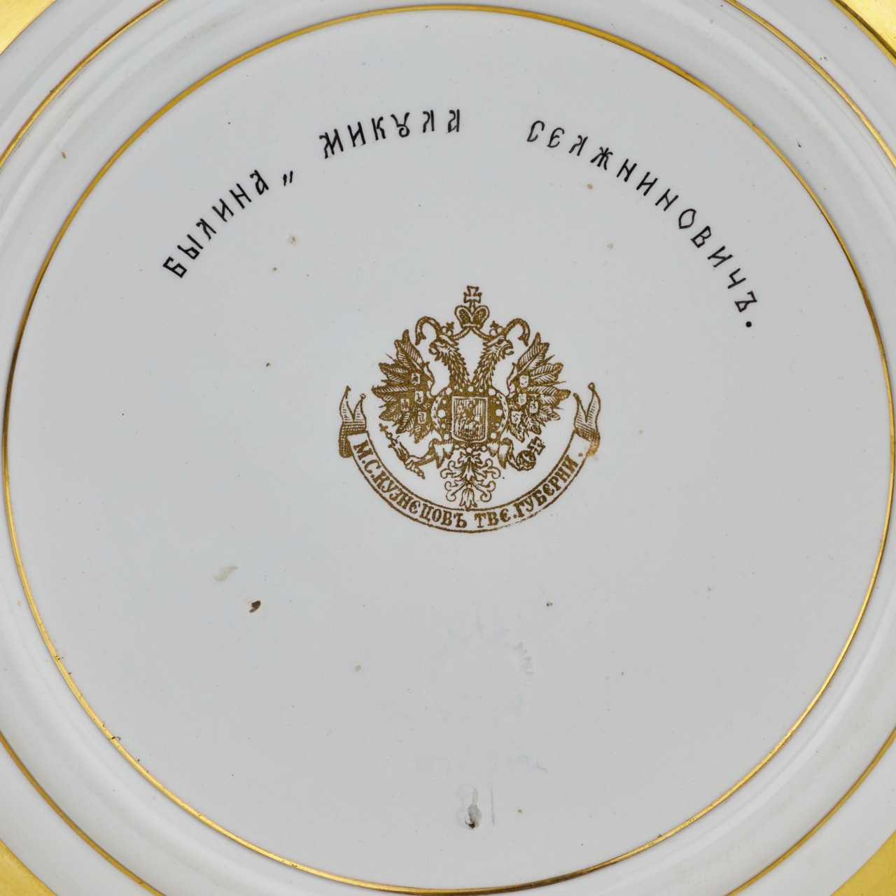 Большая фарфоровая декоративная тарелка с жанровой сценой, исполненной в технике полихромной росписи, расположенной в зеркале тарелки и стилизованным лиственным орнаментом в русском стиле по плоскому борту блюда. Живописная роспись тарелки выполнена вручную. По рельефному краю борта тарелки нанесена золотая и синяя декоративные полосы. Такое декоративной убранство и плоский борт придает тарелке вид жанровой картинки, оформленной в красивую расписную рамку. Оборотная сторона тарелки декорирована по ее борту золотым крытьем и надписью с названием сюжета росписи. Жанровая сцена в центре тарелки выполнена на мотив русской былины «Микула Селянинович», о чем сообщает надпись на дне блюда - былина «Микула Селянинович». Изображен эпизод призвания богатырем Вольгой Святославичем Микулы Селяниновича, для сбора податей.Типичным является изображение былинного героя не в изящные сапоги, а в простые крестьянские лапти. Некоторые исследователи русского эпоса трактуют эту сцену как встречу бога-охотника с богом пахарем. Такая трактовка связана с тем, что Микула Селянинович в русской культуре олицетворял бога земледелия. В нижней левой части жанровой картинки указана подпись художника-керамиста, представленная в виде монограммы, состоящей из латинской и русской заглавных печатных букв «DБ» (неизвестный художник фабрики Кузнецова). Тарелка входит в состав серии из нескольких аналогичных тарелок декорированных на тему русского народного эпоса (не менее 9 штук), исполненных в русском стиле во второй половине 19 века (1870-1880-е годы) на Тверской фаянсовой фабрике М.С.Кузнецова,. Тверская фаянсовая фабрика была приобретена М.С.Кузнецовым в 1870 году, которая уже при первом хозяине и основателе фабрики (семейство Ауэрбах) прославилась в России изделиями в псевдорусском стиле. Серия былинных тарелок Тверской фабрики, возможно, экспонировалась на Политехнической выставке 1889 года. Производственная марка фабрики М.С. Кузнецова в Твери в виде малого государственного герба - двуглавый орел и надписи «М.С. Кузнецов Твер губерн», расположенной на ленте. Печатная марка исполнена золотом, что свидетельствует об особом назначении предмета.Российская империя, Тверская губерния. Фабрика М.С.Кузнецова. 1870-1889 годы. Фарфор, ручная полихромная роспись, золочение, золотое крытье. Коллекционная сохранность. Диаметр - 25.5 см, вес - 668 гр.