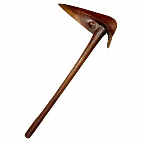 Rare Kanak war club of the Kagu type (Birds beak) in hardwood, from New Caledonia, Melanesia, 19th century.This is an exceptional Kanak art collectors item due to its imposing size and its rare balance on this type of object.This ancient combat tool, carved in a beautiful solid hardwood decorated with a magnificent dark brown and shiny patina, is distinguished by its long cylindrical handle which ends in a stylized birds head, with an elongated beak, two raised eyes and a crest falling at the back of the neck.The handle reflects the traditional style of Kanak clubs. Clubs are an integral part of the Kanak arsenal. Although several forms exist, the most widespread are divided mainly into two categories: phallic brain teasers and those in the shape of a birds beak or turtle.Their use for war and dances is omnipresent throughout New Caledonia. According to Maurice Leenhardt, these objects are used to express virility during war speeches, an essential aspect of the oral tradition. The different forms do not correspond to a specific use, but reflect regional styles, each socio-political group imprinting its identity on the objects it uses.These clubs were brandished during the pilous, in particular for the declamation of genealogical speeches, symbolizing masculine virility and power. A drawing in Indian ink on tracing paper, made around 1954, attests to the objects collected before 1900 by the curator Bernier for the New Caledonian Museum. This model of Kanak puzzle, called “phallic”, represents a formidable weapon used in close combat in New Caledonia.