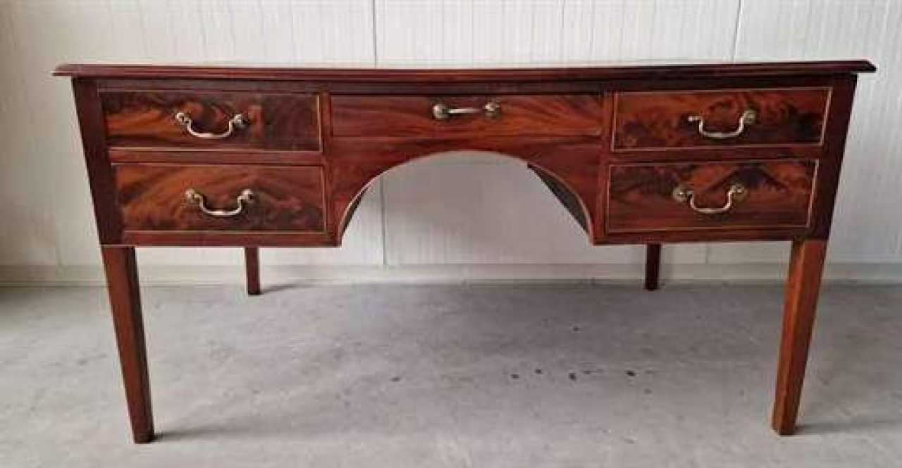Отреставрированный антикварный двусторонний письменный стол. Отреставрирован. Красное дерево, кожа, латунь. Англия. 1860-е годы. Размеры: высота 77 см; длина 143 см; ширина 90 см.