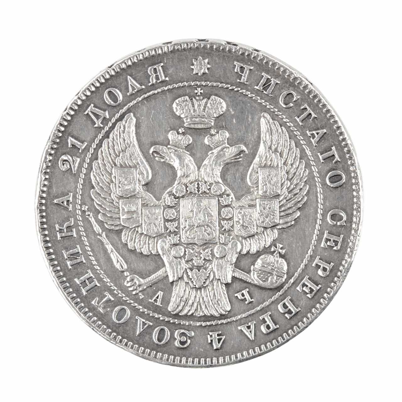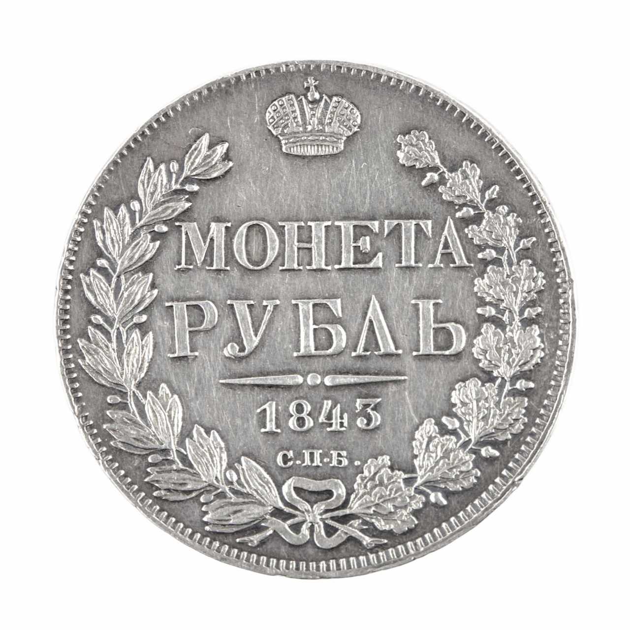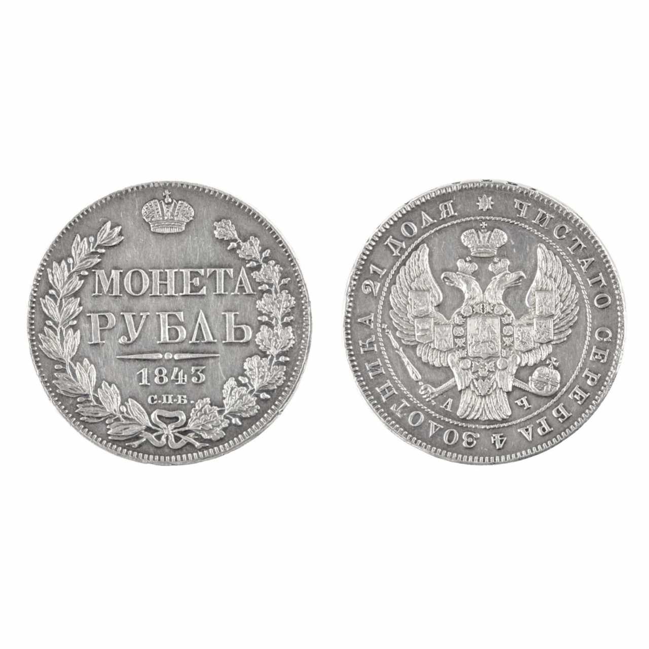Серебряный рубль 1843 года. Россия - Николай I (1825-1855). На аверсе: Монета рубль. С.П.Б., 1843 год. На реверсе: двуглавый коронованный орел. Материал: серебро 831,5 пробы. Вес: 20,44 грамма. Диаметр: 35 мм.