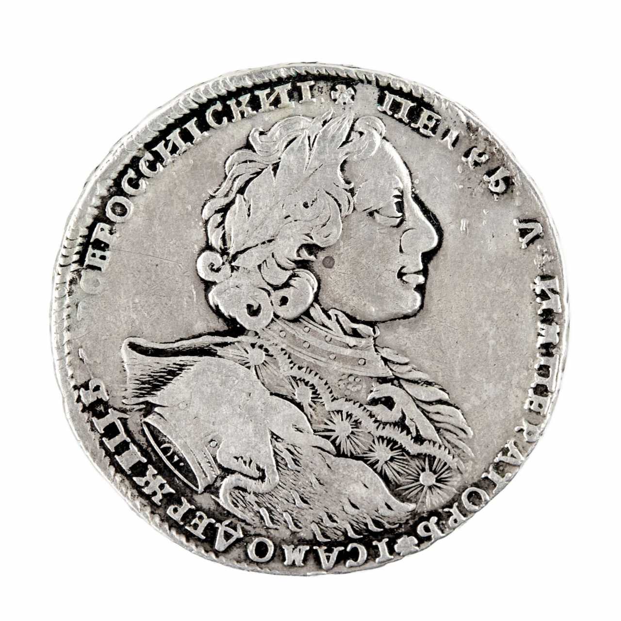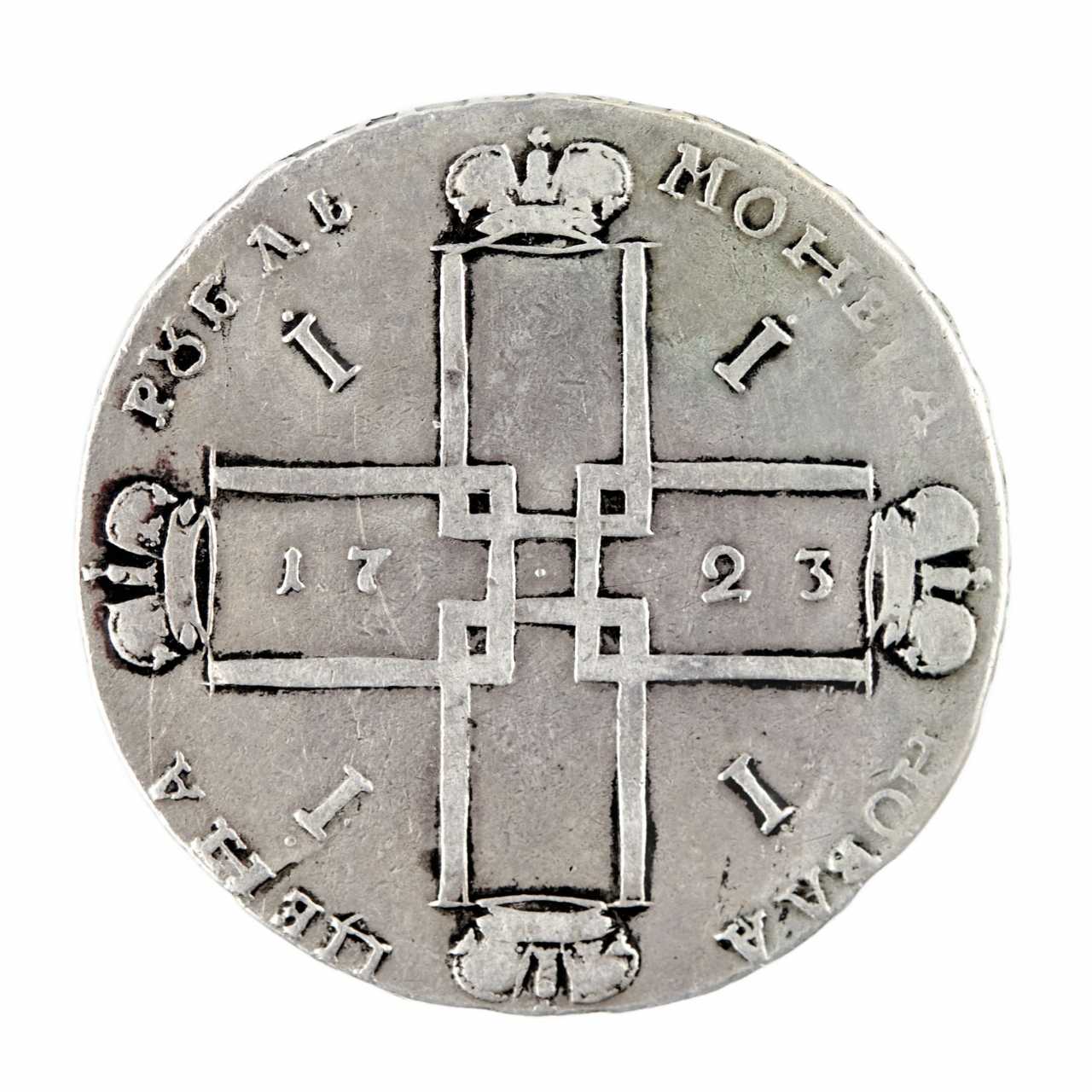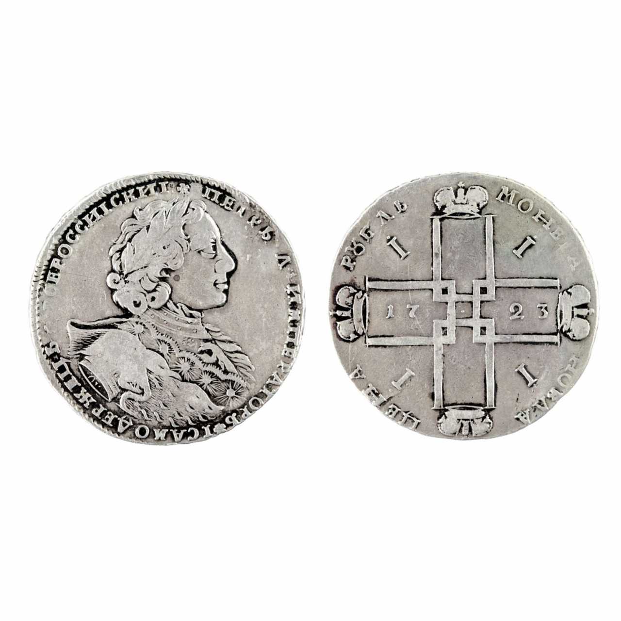 Серебряный рубль Петра I, 1723 года. А. в горностаевой мантии без Андреевского креста. На реверсе: Бюст императора Петра I в лавровом венке, развернутый вправо. На реверсе: оригинальная геральдика венценосного креста из четырех П, в углах которого единицы. Вес: 28.29 гр. Диаметр: 40 мм.