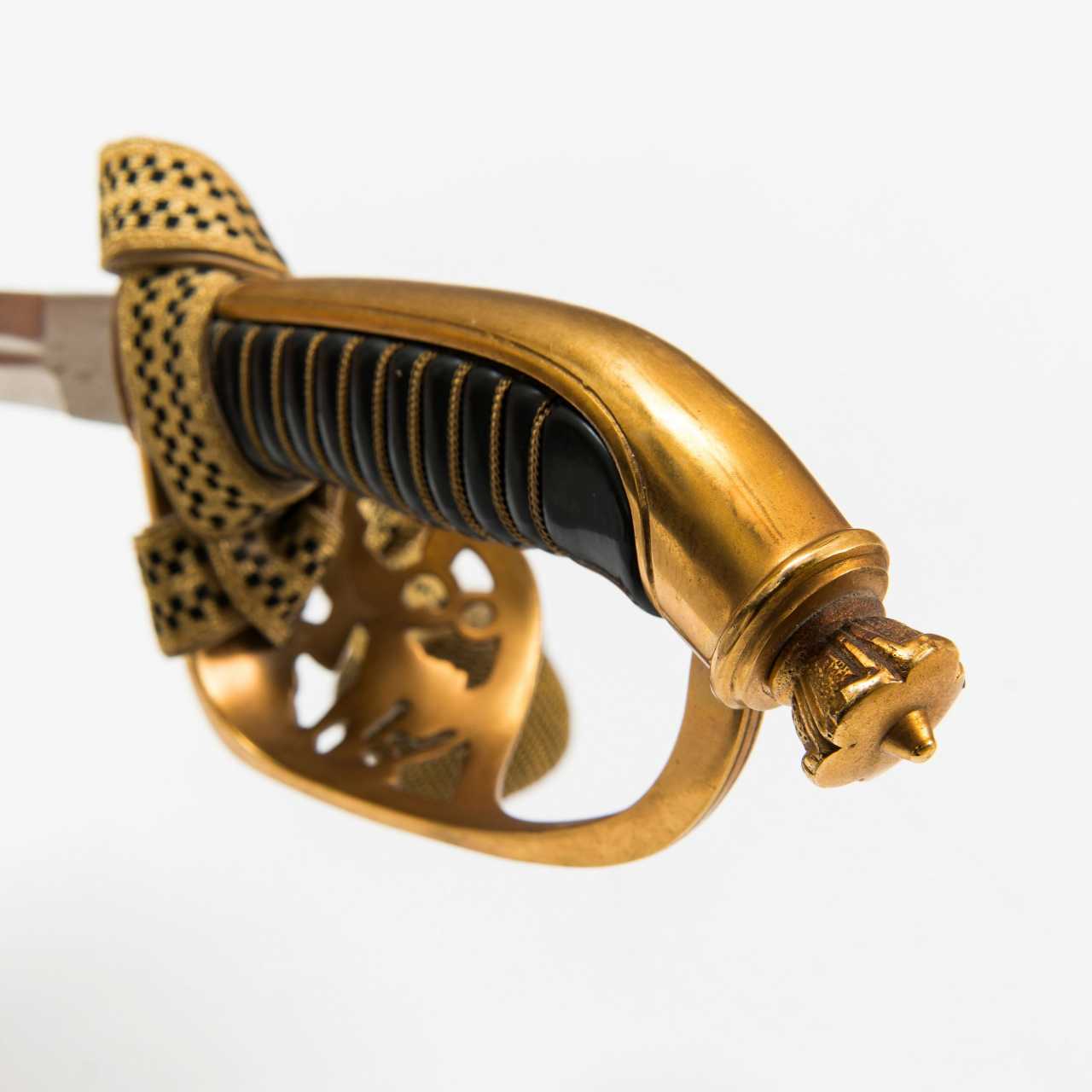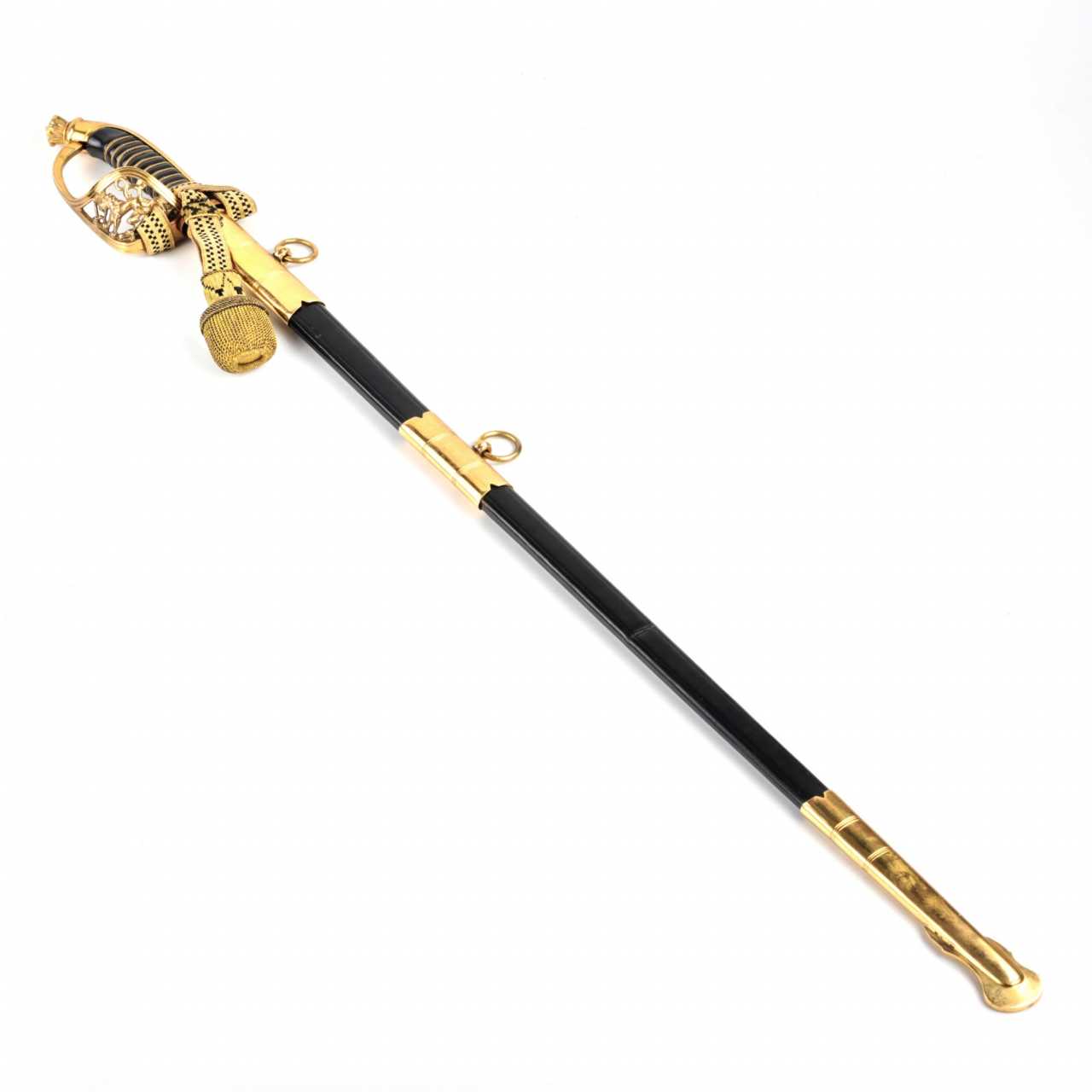 Парадная сабля финского морского офицера. Вторая четверть - середина 20 века. Рукоять выполнена из позолоченной латуни. Изогнутый эфес декорирован гербовым львом Финляндии. Стальной клинок с маркировкой E&F Hörster Solingen. Шитые кожаные ножны с латунной позолоченной фурнитурой. Длина клинка 77,5 см.