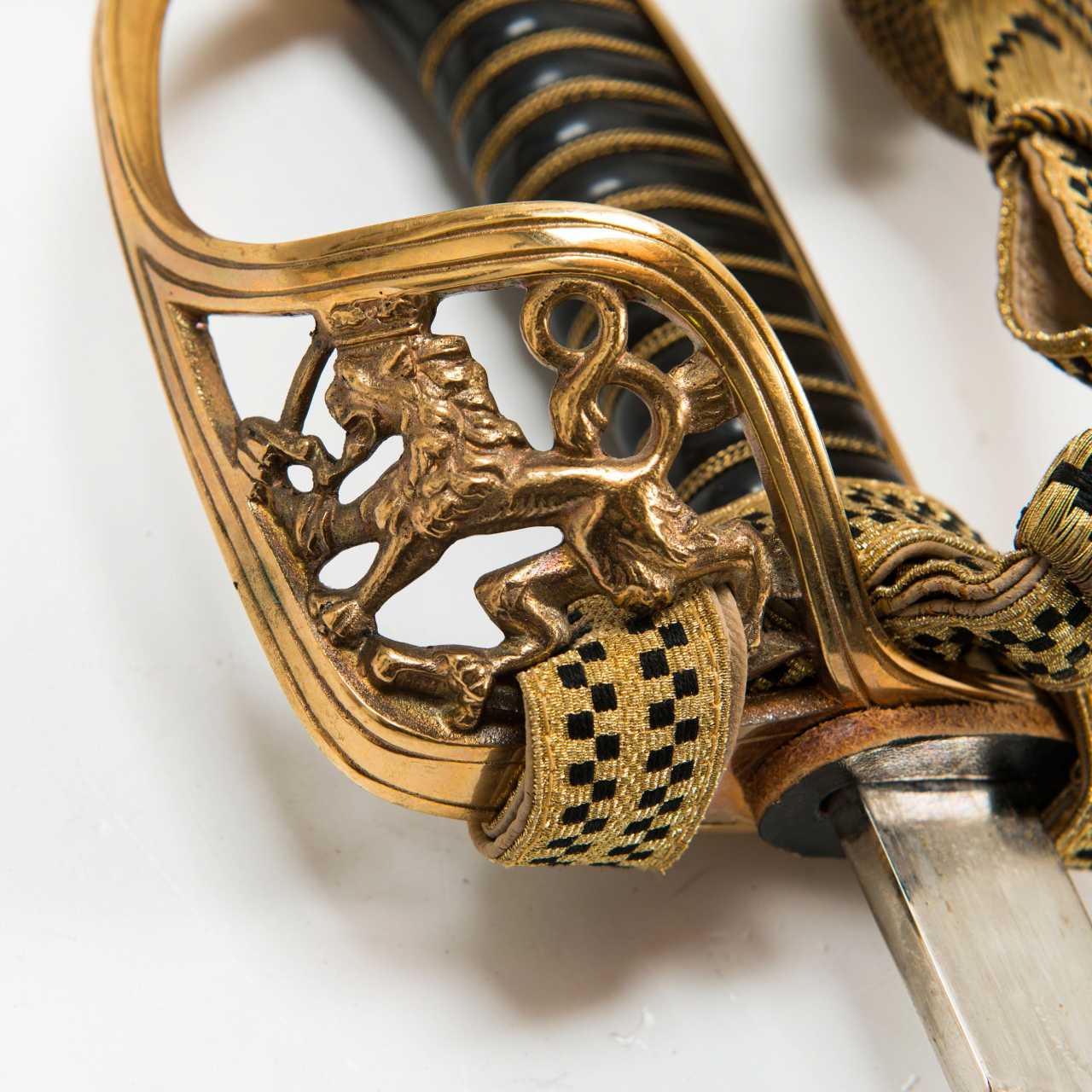 Парадная сабля финского морского офицера. Вторая четверть - середина 20 века. Рукоять выполнена из позолоченной латуни. Изогнутый эфес декорирован гербовым львом Финляндии. Стальной клинок с маркировкой E&F Hörster Solingen. Шитые кожаные ножны с латунной позолоченной фурнитурой. Длина клинка 77,5 см.