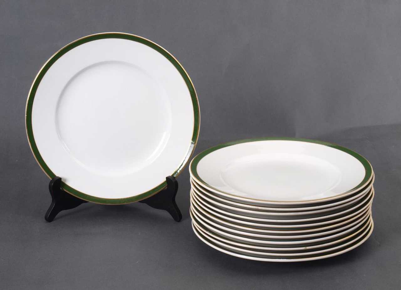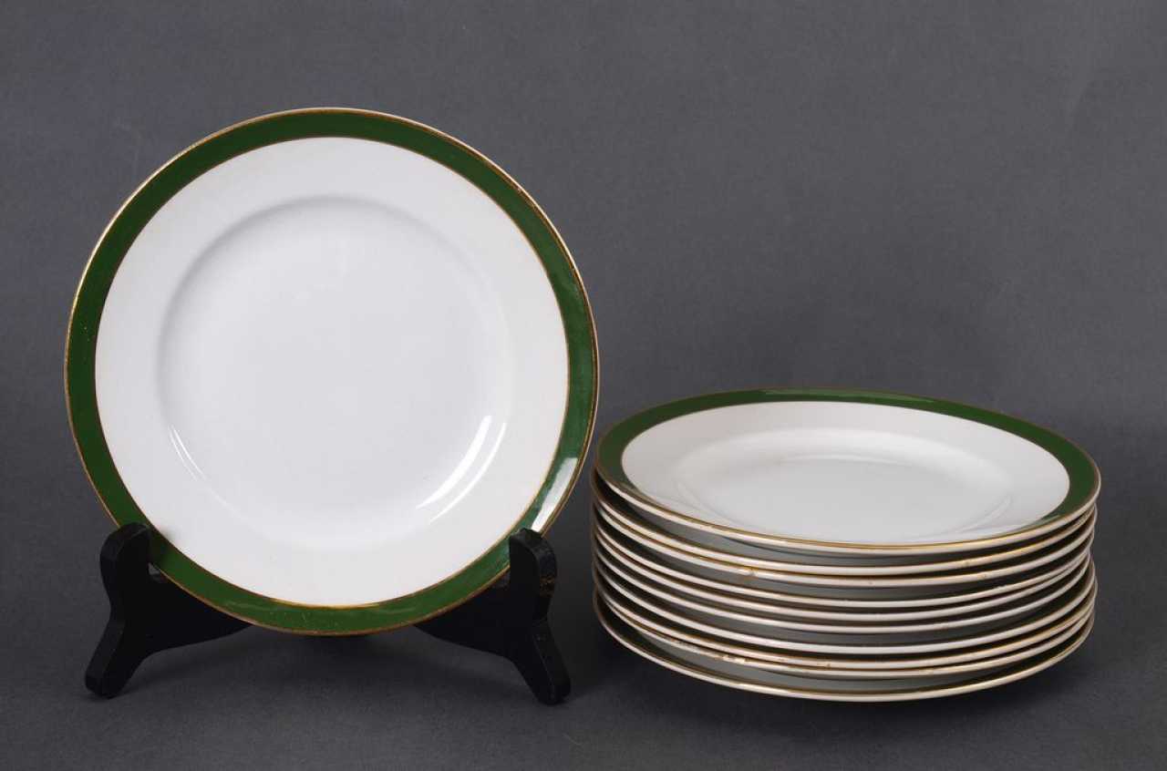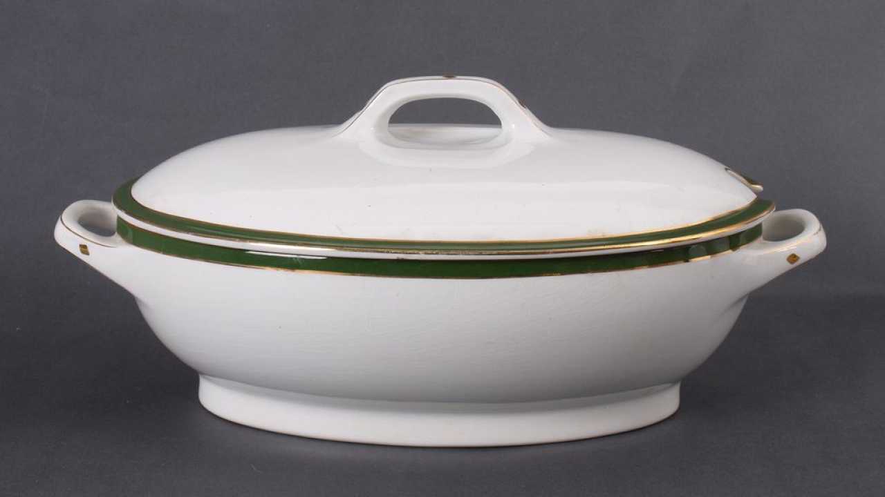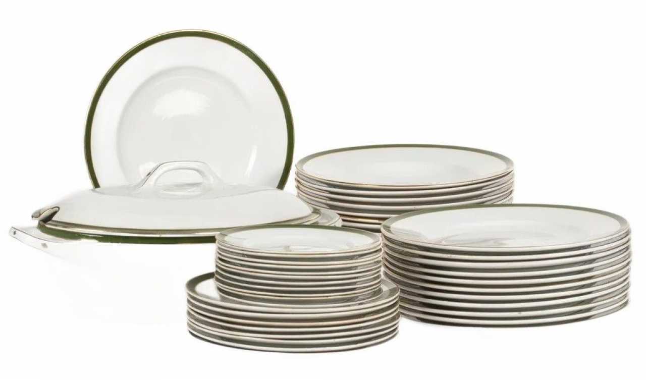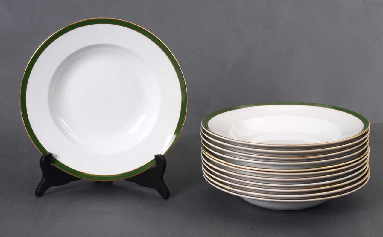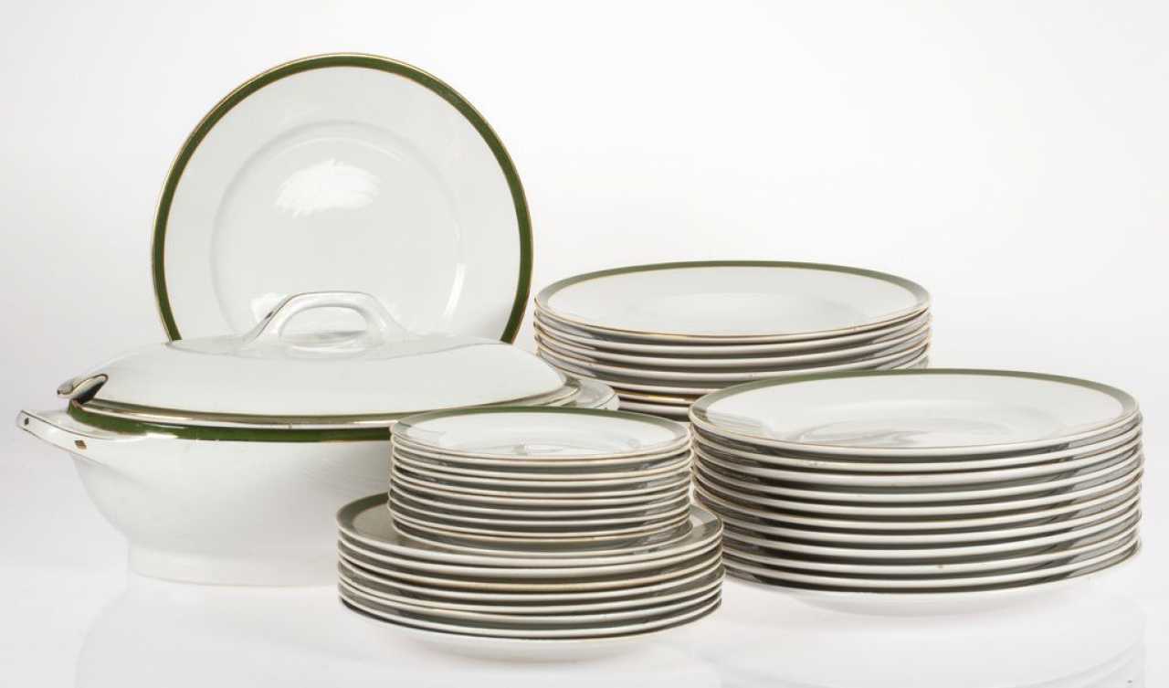 1874-1909. Германия, Villeroy and Boch. № 3. MC 34, 33 предмета. Фаянс, позолота. Диаметр наименьшей тарелки 16,2 см, диаметр средней тарелки 21 см, диаметр суповой тарелки 24,7 см, высота суповой тарелки 4,5 см, диаметр наибольшей тарелки 25,3 см, высота наибольшей тарелки 2,8 см, размеры суповых тарелок: высота 10,5 см, длина 38 см, ширина 22 см
