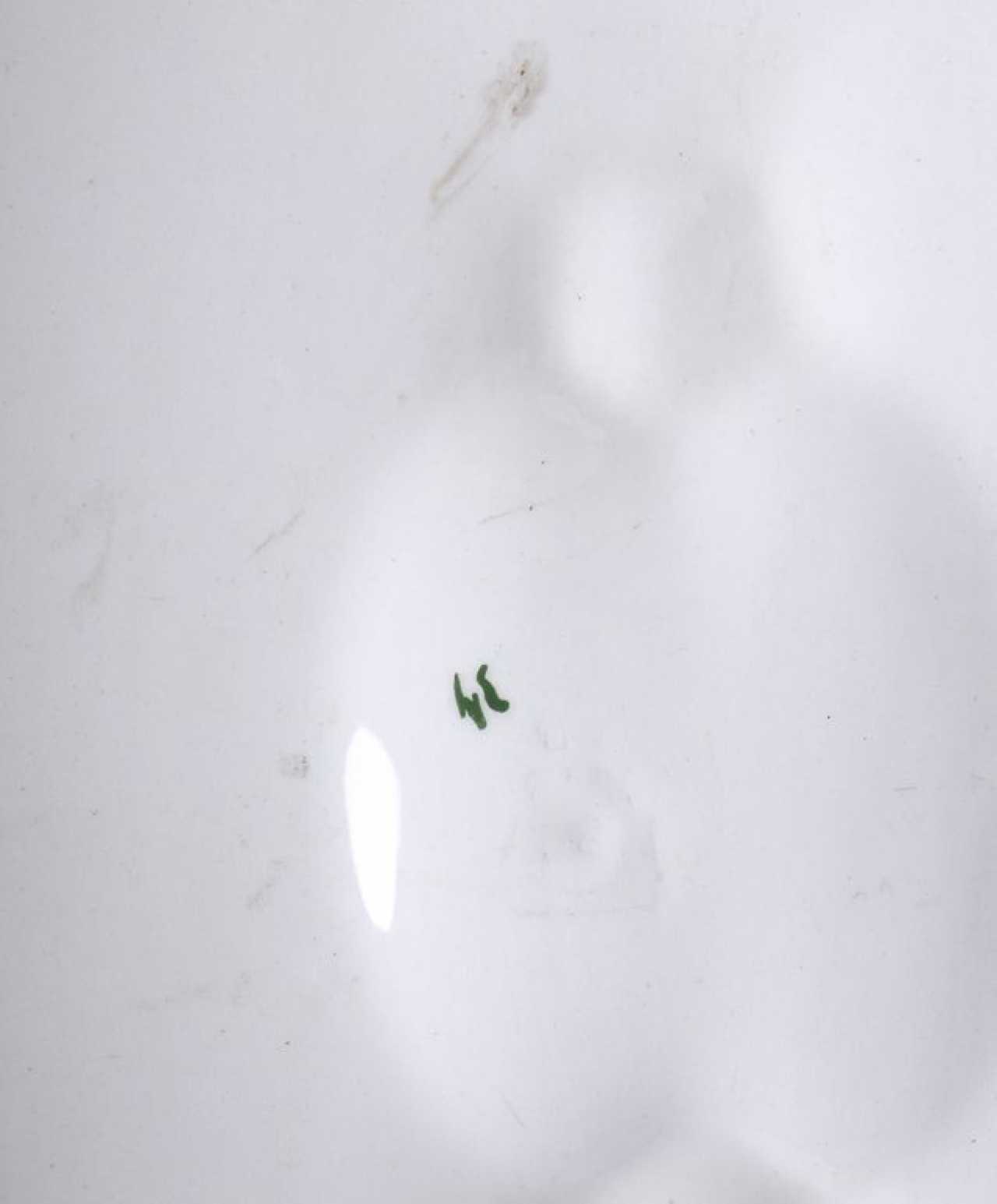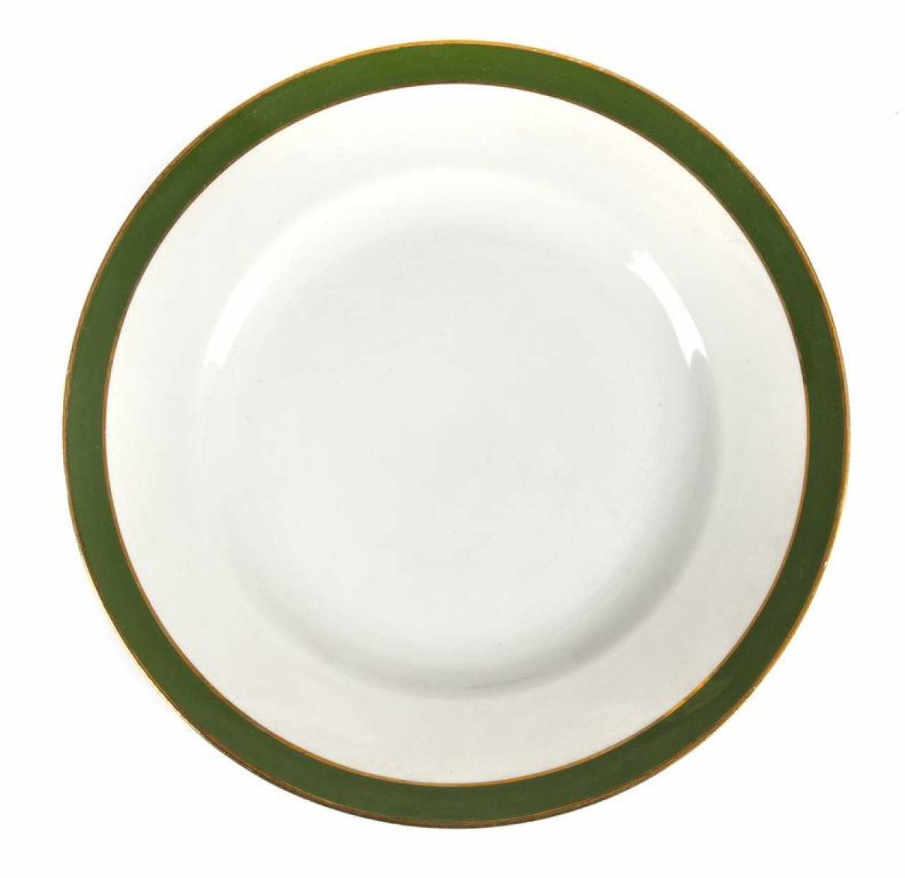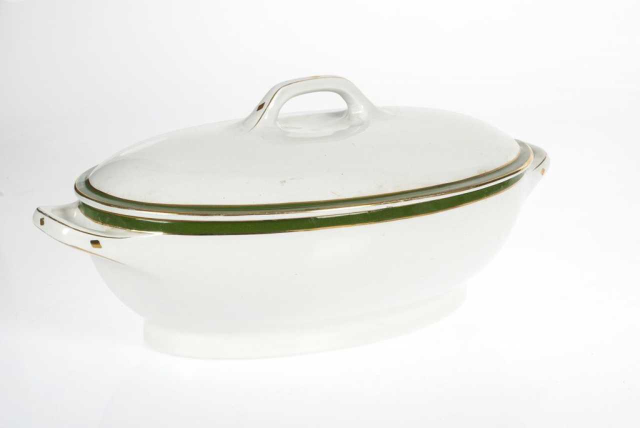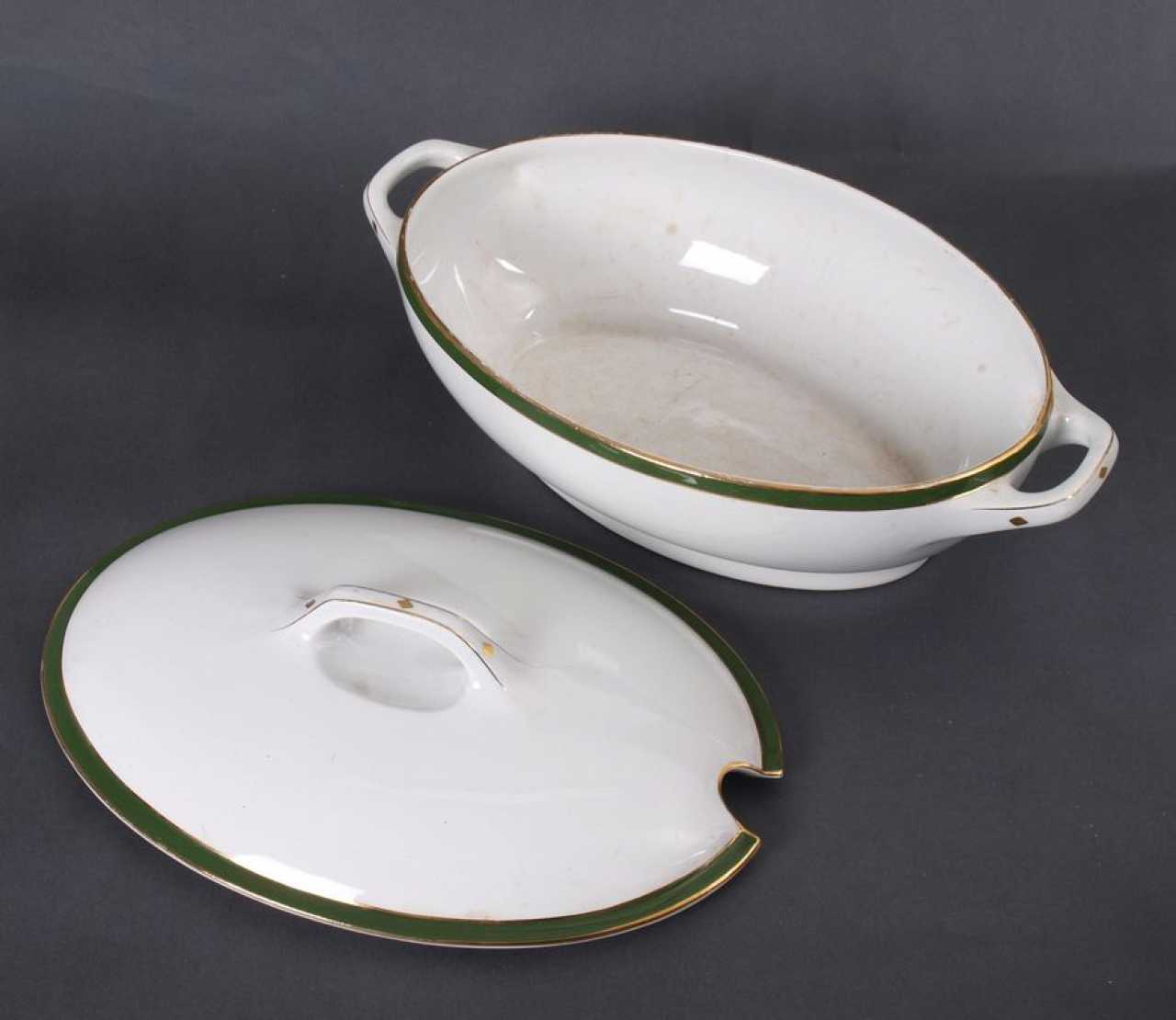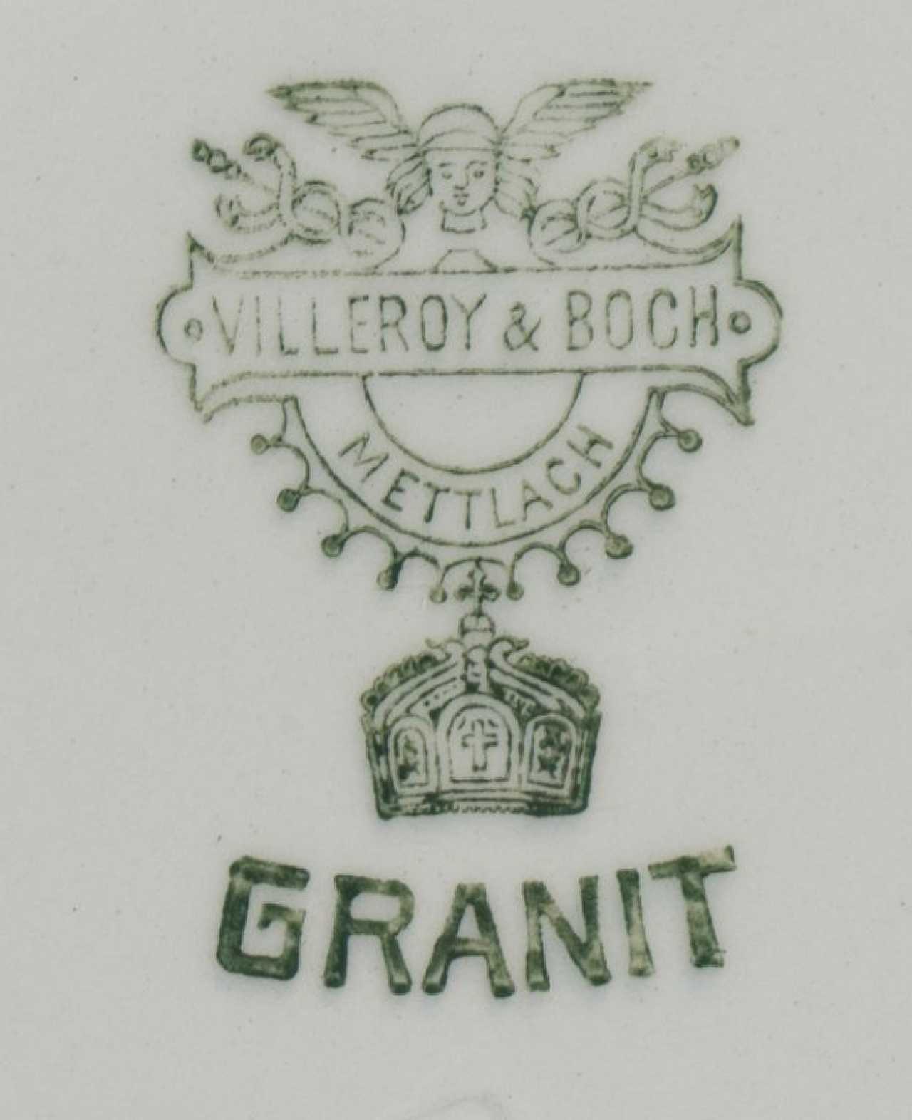 1874-1909. Германия, Villeroy and Boch. № 3. MC 34, 33 предмета. Фаянс, позолота. Диаметр наименьшей тарелки 16,2 см, диаметр средней тарелки 21 см, диаметр суповой тарелки 24,7 см, высота суповой тарелки 4,5 см, диаметр наибольшей тарелки 25,3 см, высота наибольшей тарелки 2,8 см, размеры суповых тарелок: высота 10,5 см, длина 38 см, ширина 22 см