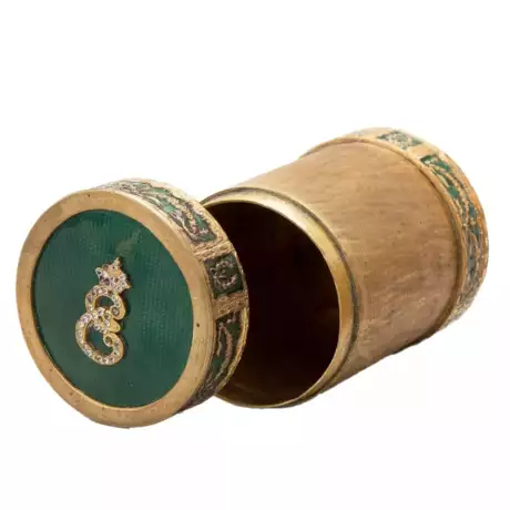 Цилиндрическая Шкатулка- Табакерка,с крышкой ,украшенной вензелем Е,зеленой эмалью,камнями и орнаментом по золоченному фону, поясами гирлянд на крышке и основании. Предположительно Россия