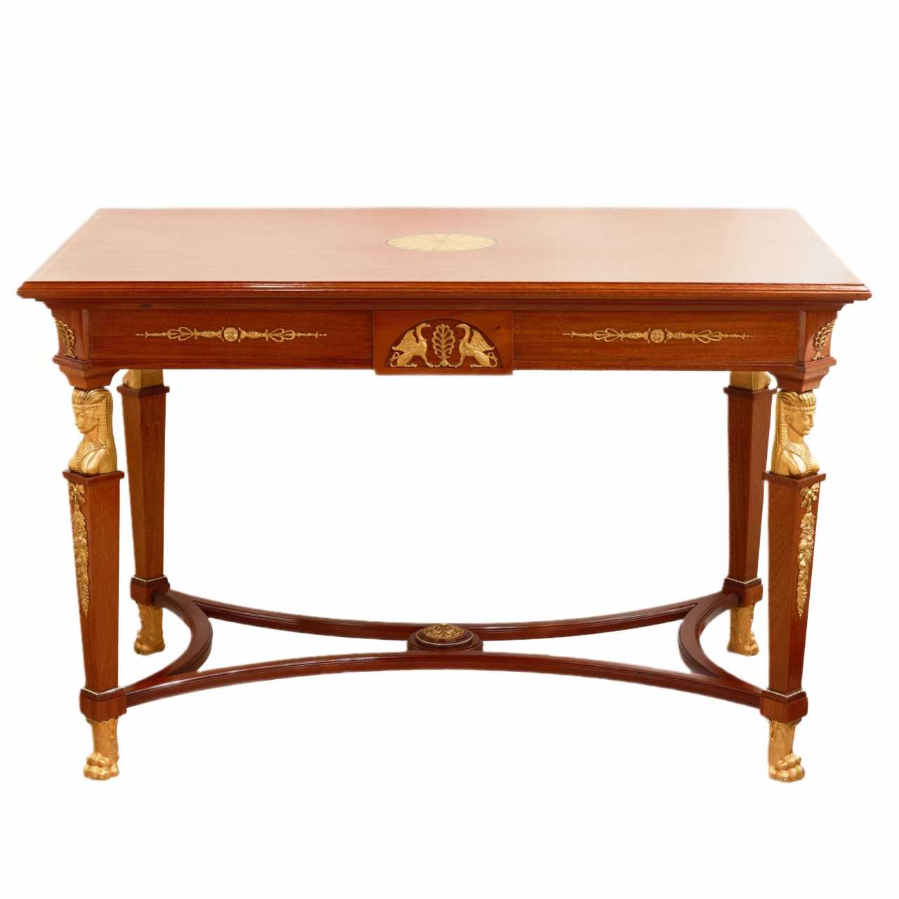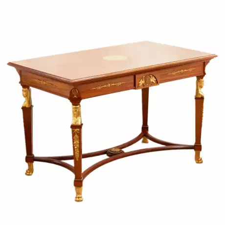 Стол в стиле ампир, украшенный изысканным деревянным шпоном и позолоченной бронзой. Его ножки украшены сложной отделкой из позолоченной бронзы с изображением женских кариатид и львиных лап. Центральная часть украшена бронзовыми элементами, в том числе грифонами и орнаментом в стиле ампир. Столешница украшена узором маркетри. Размеры: Высота: 71 см, Столешница: 110 см (длина) x 66 см (ширина)