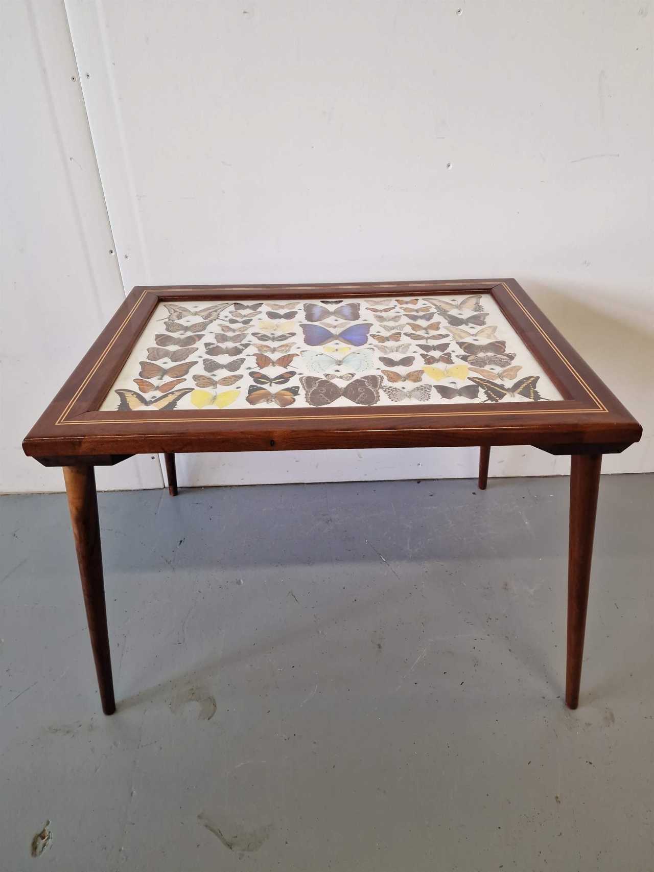 Винтажный стол с бабочками. Бразилия. 1960-е годы. Экзотическое дерево, инкрустация, бабочки разных видов. Размеры: высота 52 см; длина 71 см; ширина 51 см