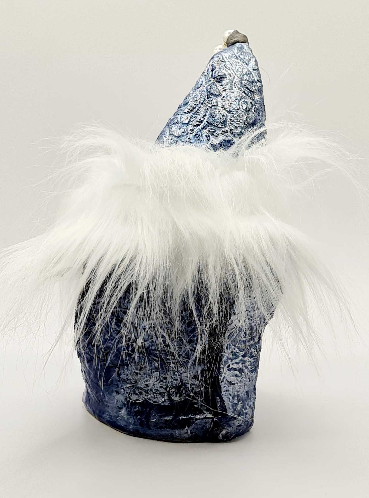 Этот миниатюрный рюкзак из керамики, отделанный витым шнуром, бижутерией и мехом.