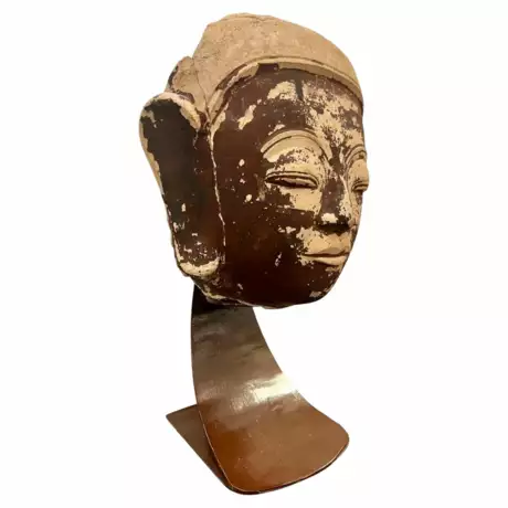Stoneware Buddha head, Shan State Kingdom, Burma, 16th18th centuryBuddha head from a temple facing built entirely of mud bricks during the 16th18th century. Maravijaya Buddha. Shan period, Burma.The finesse of the master sculptors work is remarkable here: the large almond-shaped eyes with half-closed eyelids advocate introspection and humility, while the fine, well-defined mouth with pronounced corners preaches benevolence and universal love. His head is adorned with the Ushnisha, a cranial protuberance characteristic of Buddha and a symbol of his knowledge. This Buddha exudes emotion and wisdom, inviting the viewers eye and mind to meditative calm and enlightened concentration.This collectors piece stands out for its fine craftsmanship and its expression of wisdom, from which emanates great spirituality. Properly pedestal-mounted, this piece exudes serenity and soothing energy, and can easily be placed in your home on a shelf or in a bookcase.Height 36 cm on base.