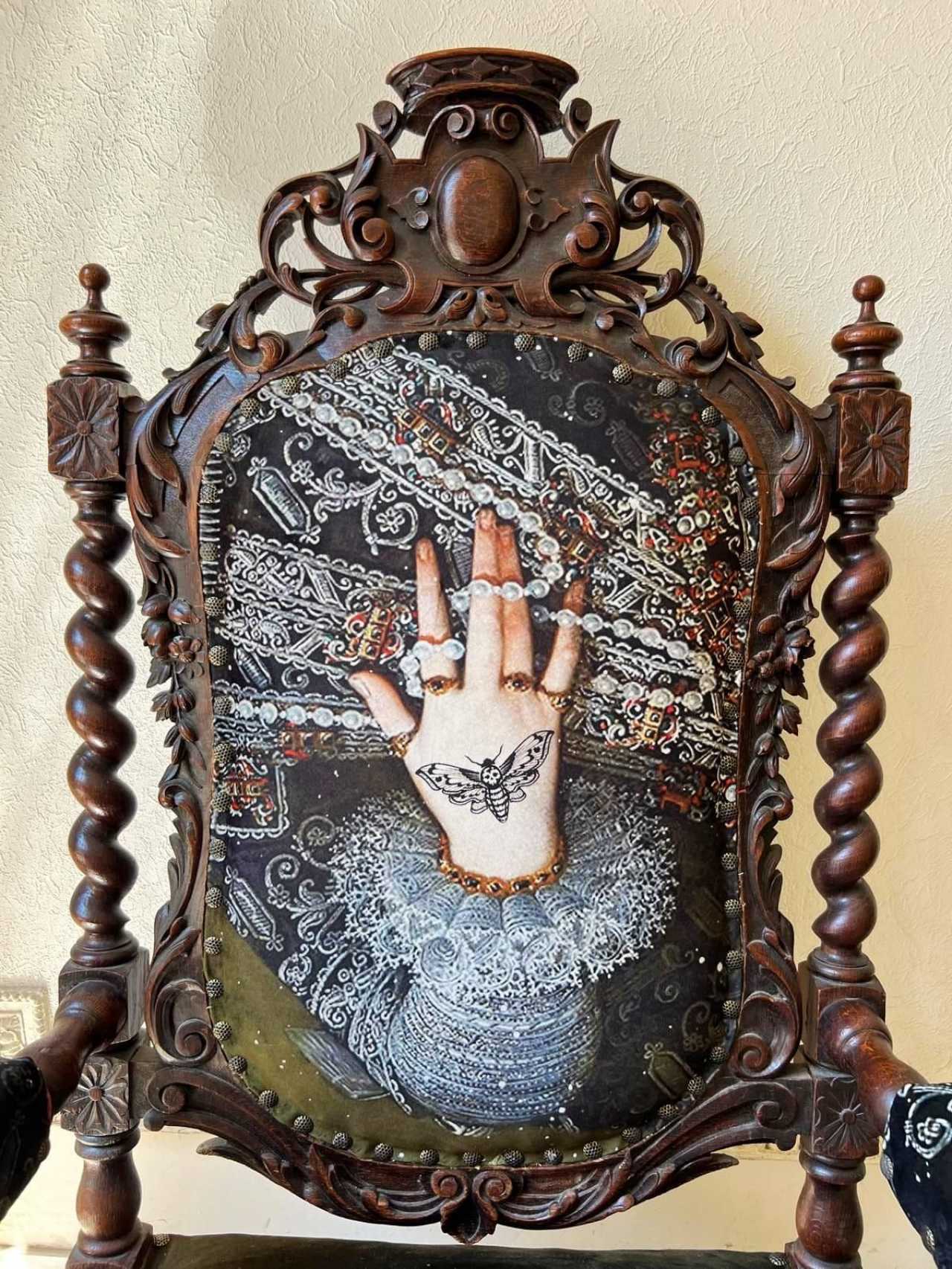 The royal Louis XIII style armchair in carved oak represents the pinnacle of old-world elegance and luxury, beautifully adapted to contemporary needs. Every detail of its sturdy oak wood, painstakingly hand-carved, evokes the majesty and sophistication of the Louis XIII era. The finely crafted patterns and delicate ornamentations demonstrate traditional artisanal know-how.Completely reupholstered, this armchair now has a high-end printed velvet, adding a touch of modernity while retaining its historic character.The choice of fabric, exceptional in its quality and refinement, offers a sumptuous look and unparalleled comfort. The prints on the velvet captivate with their shine and texture, enhancing the visual appearance of the armchair and blending perfectly into an opulent interior.This unique and grandiose armchair is only available in a single copy, making it a truly exclusive piece. By its mere presence, it transforms any space into a majestic and elegant place. Whether installed in a sophisticated living room, a prestigious office or a luxurious bedroom, this armchair will bring incomparable radiance, guaranteeing a breathtaking visual impact and unrivaled aesthetics.In short, this royal Louis XIII style armchair is more than just a piece of furniture; it is a work of art and a living testimony of artisanal heritage, ready to embellish and magnify any grandiose interior.