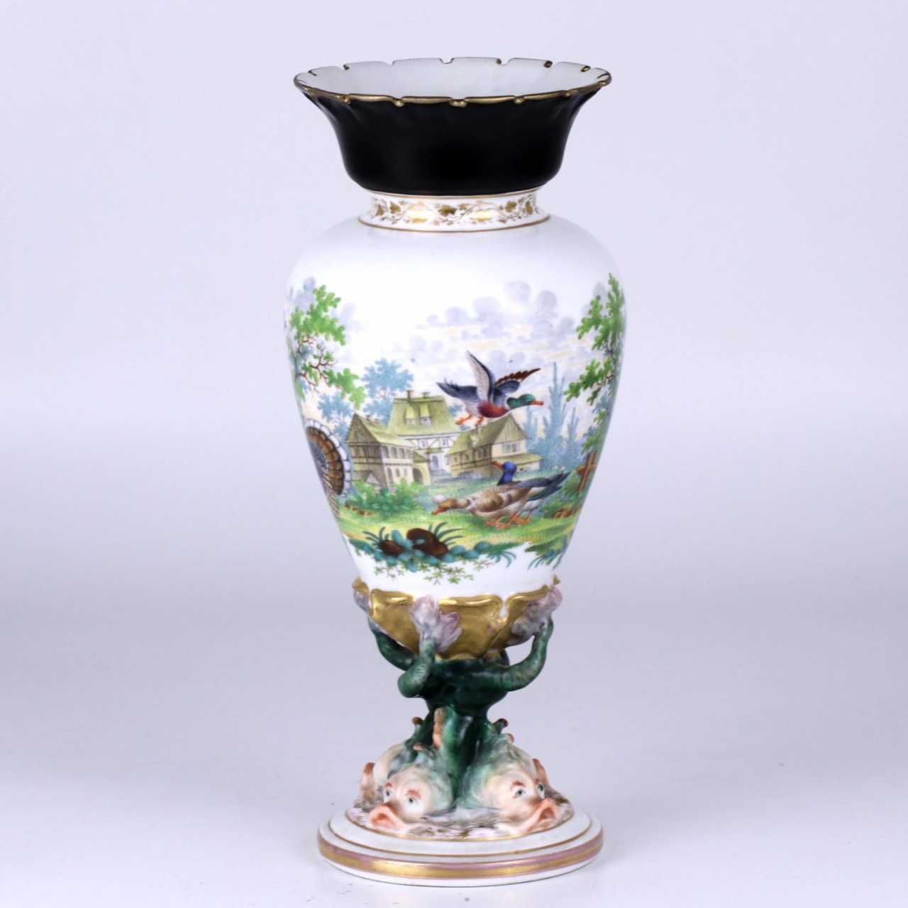 Фарфоровая ваза CMHR Hutschenreuther Hohenberg Bayern на 4 рыбах, со сценами жизни сельского двора на тулове, под кобальтовым венчиком. Германия 1914-1934.Высота - 30 см.