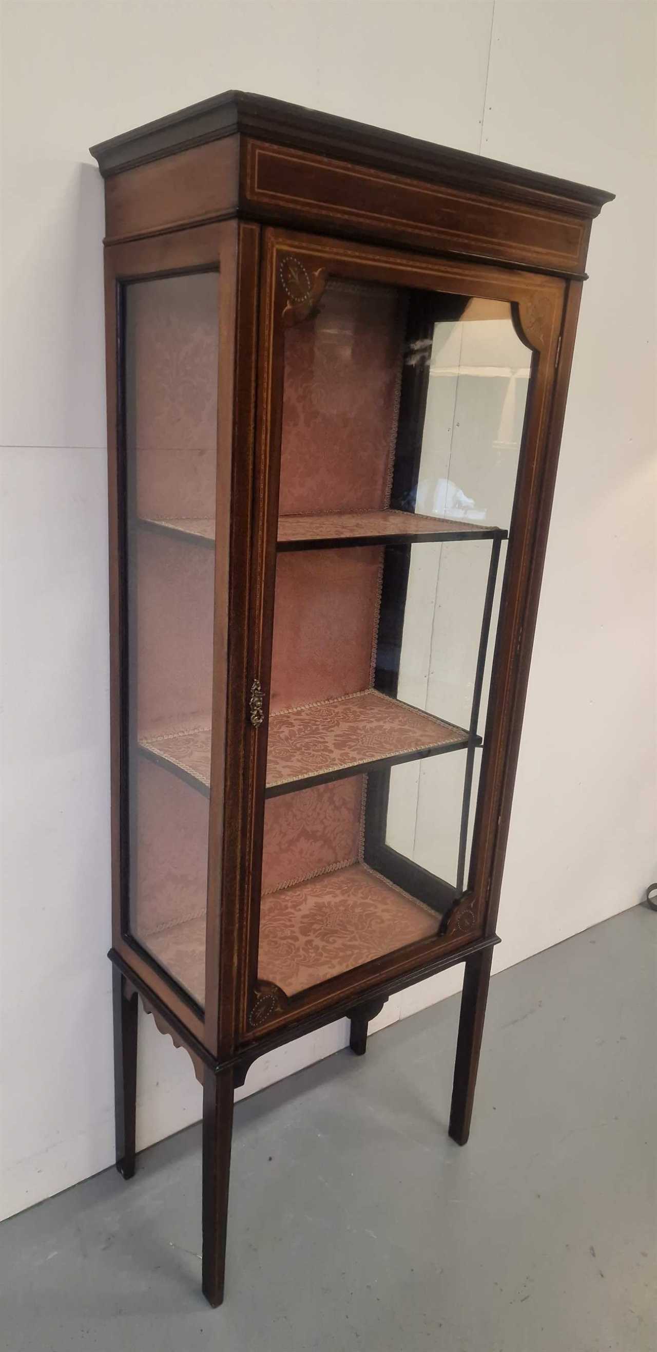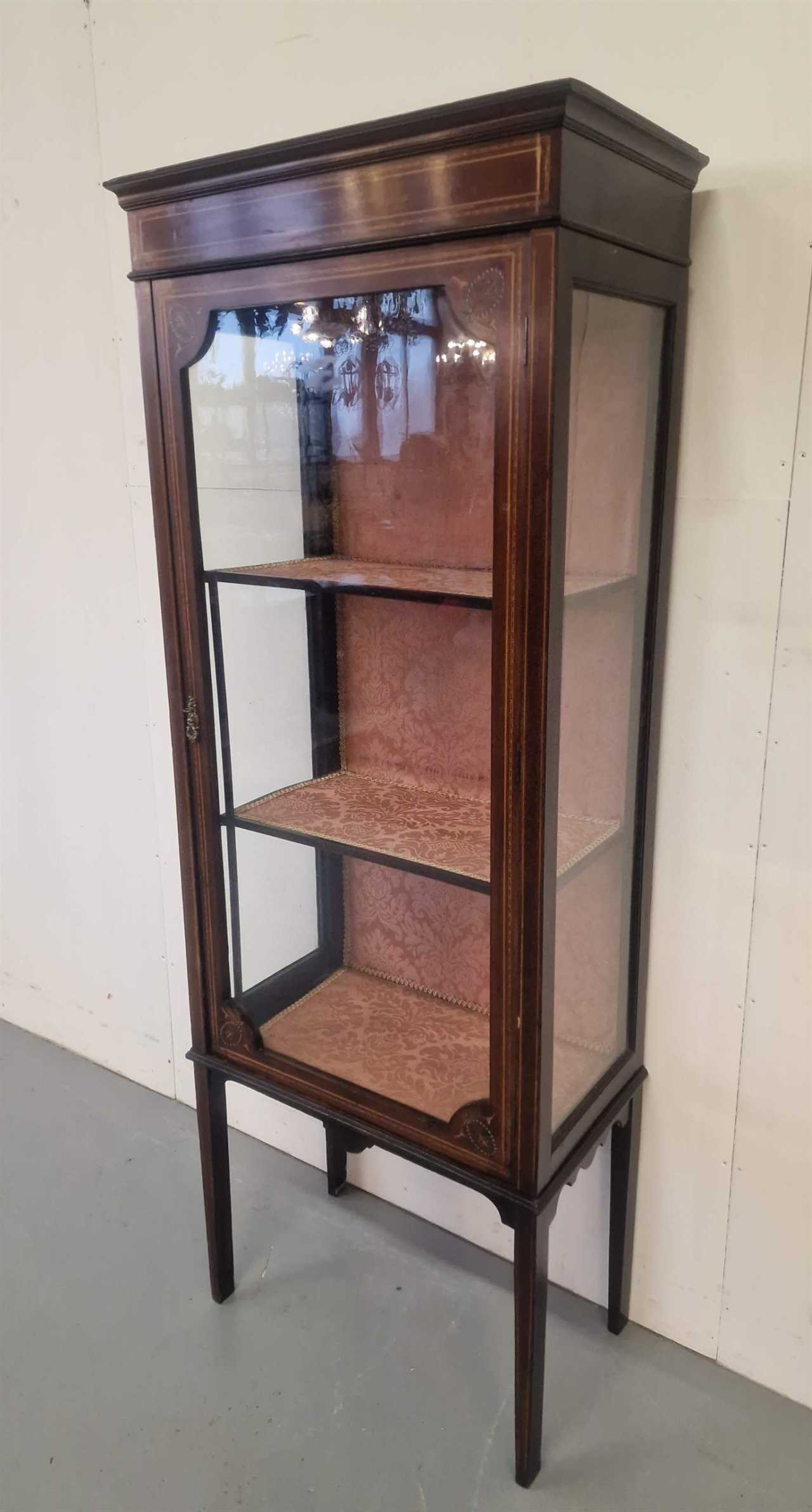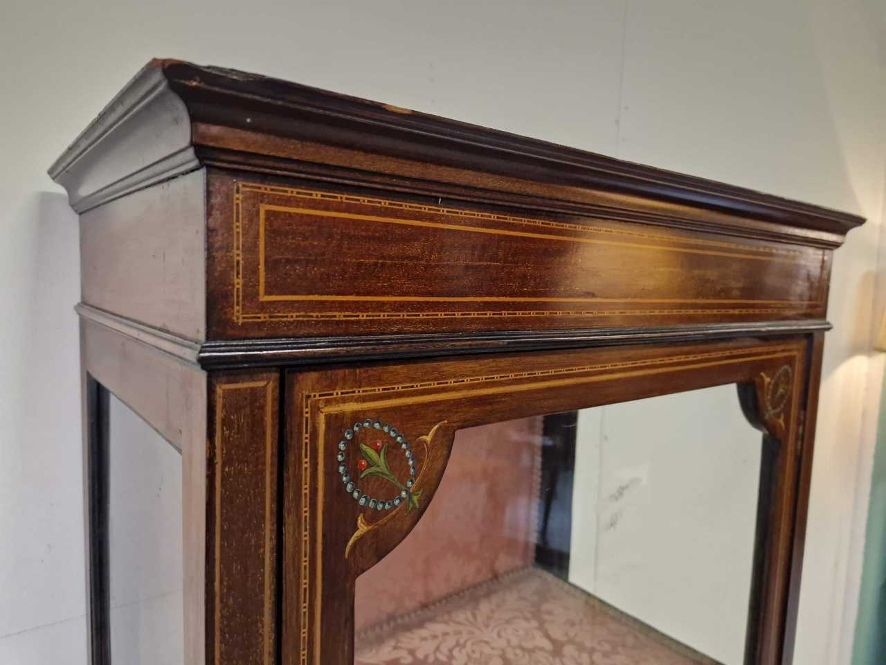 Антикварная витрина. Англия. 1880-е годы. Красное дерево, инкрустация, роспись. Размеры: высота 169 см; ширина 65 см; глубина 35 см