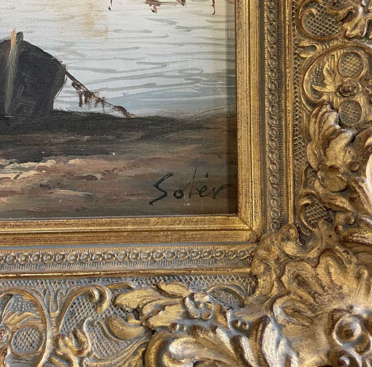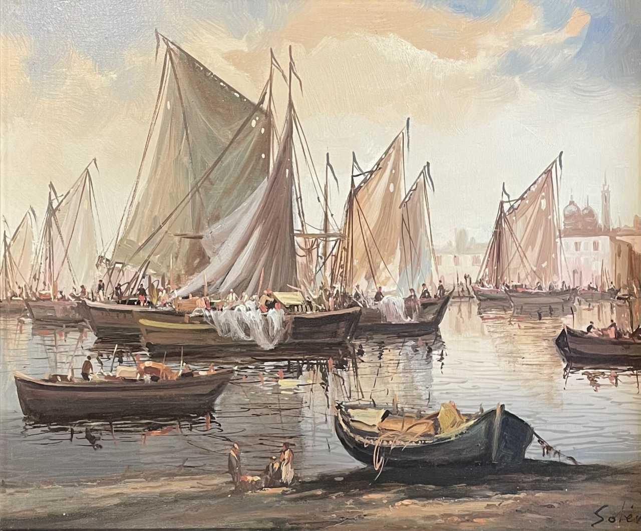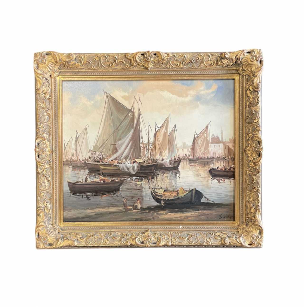 Парусные лодки в гавани, холст, масло, середина 20 века. В красивой деревянной позолоченной раме, 70 x 61 см. Подписана.