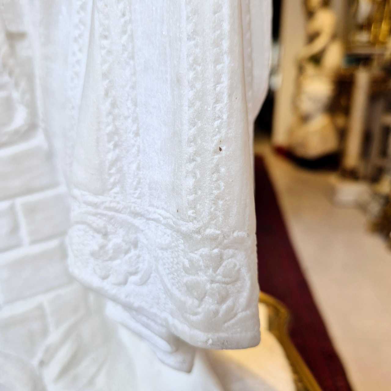 Charming sculpture of a young woman carrying a jug, signed by Bonnal on the back and inspired by “Rebecca at the Well” by 19th-century Italian School artist Guglielmo Pugi.The sculpture in fine white Carrara marble, created between the end of the 19ᵉ century and the beginning of the 20ᵉ century, depicts a pensive, lascivious young woman dressed in the fashion of the turn of the century: she wears a turban from which escapes curls of hair and a bracelet characteristic of the period; the cut of her dress is also very elaborate for a simple peasant woman. The finely embroidered motifs on the dress and turban are further evidence of the sculptors mastery.A delicate, feminine piece that will look great in a hallway or on a dressing table, and will make a lovely gift for an aesthete woman.Guglielmo Pugi lived in Florence, where he ran a sculpture workshop with his two sons. Their workshop, “Guglielmo Pugi e Figli”, was mainly dedicated to exports, particularly to the United States. Guglielmo Pugis work, emblematic of the Art Nouveau style, is characterized by direct carving in alabaster and Carrara marble (often white or veined).Some of his sculptures are now housed in Volterras Historical Alabaster Museum. Many of his works were shown at major international exhibitions, such as the 1901 Pan-American Exposition in Buffalo and the 1904 Exposition Universelle in Saint-Louis.