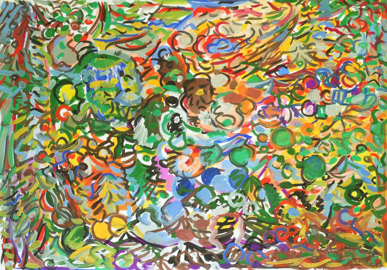 Работа исполнена в стиле Абстрактного экспрессионизма, на бумаге, гуашью.