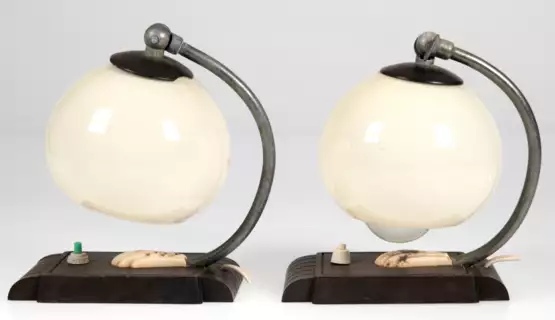 Лот 583 | 2 Bauhaus-Nachttischlampen, dunkler Kunststofffuß, kugelförmiger beiger Milchglasschirm, Gebrauchspuren, H. 20 cm