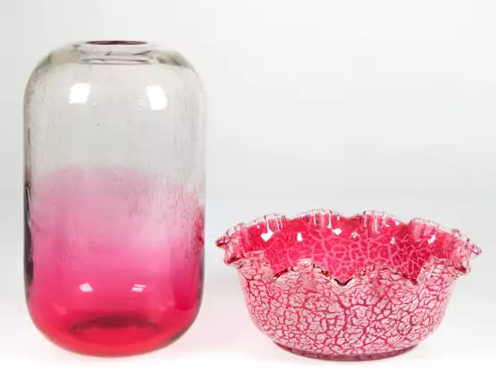 Лот 618 | 2 große Murano-Objekte, dabei Vase, Arte Vetro, Albert Seguso & Co., Klarglas im unteren Bereich rosafarbenes Glas, mit Lufteinschlüssen H. 32 cm und Schale mit gefaltetem Rand, Klarglas mit rosa Innenfang und weißen…