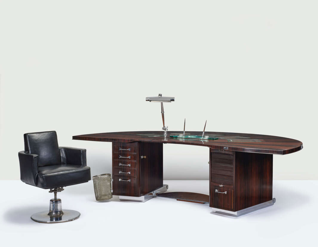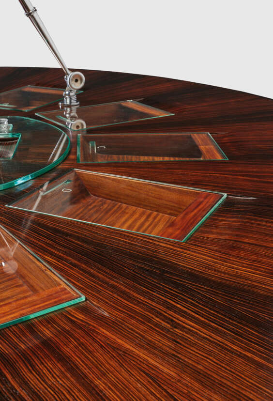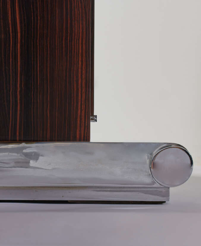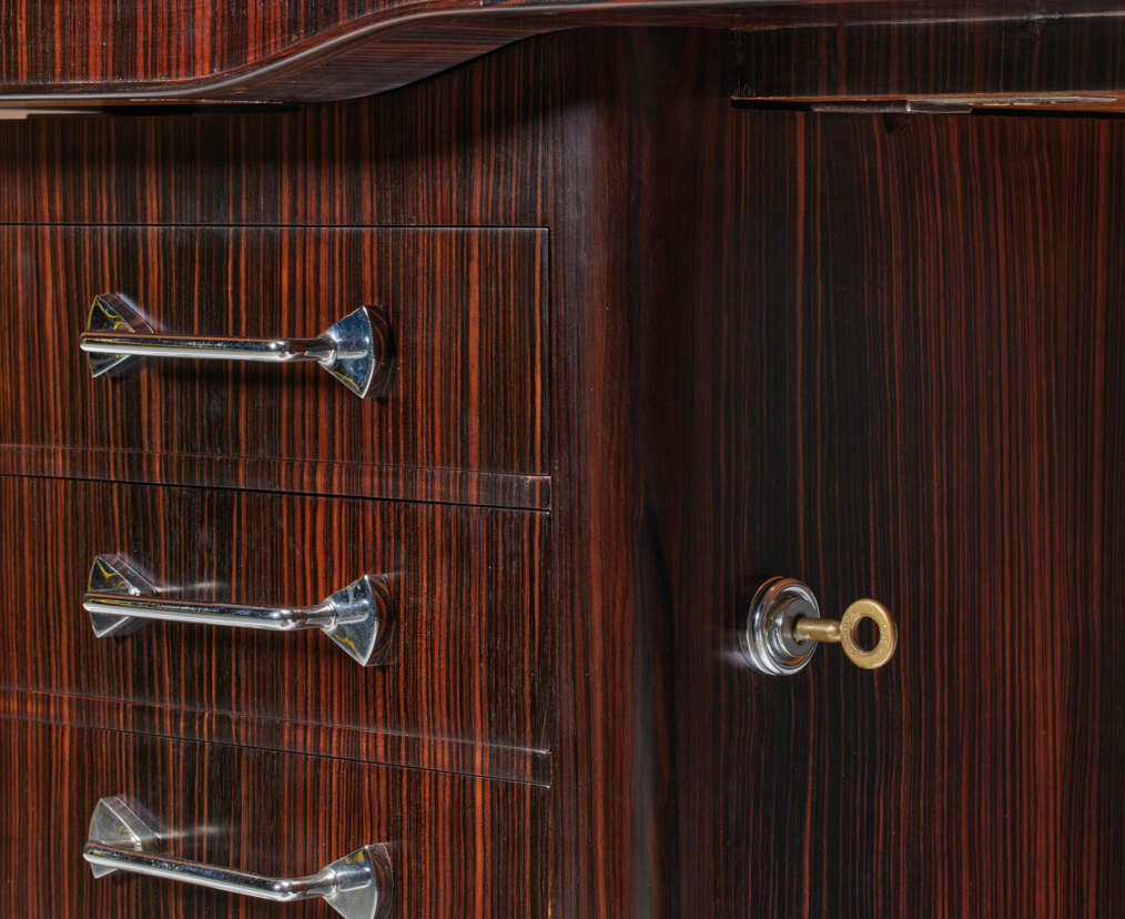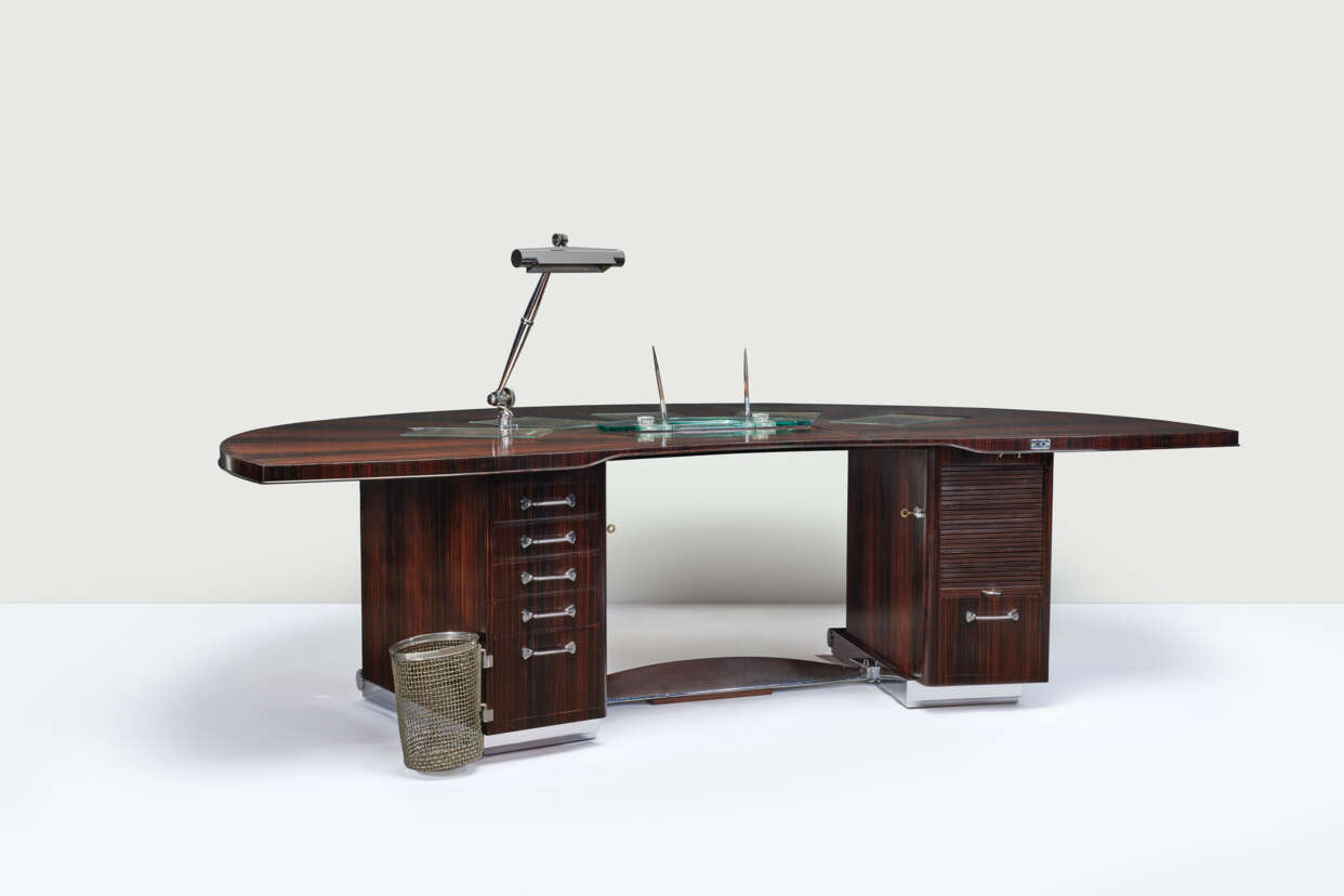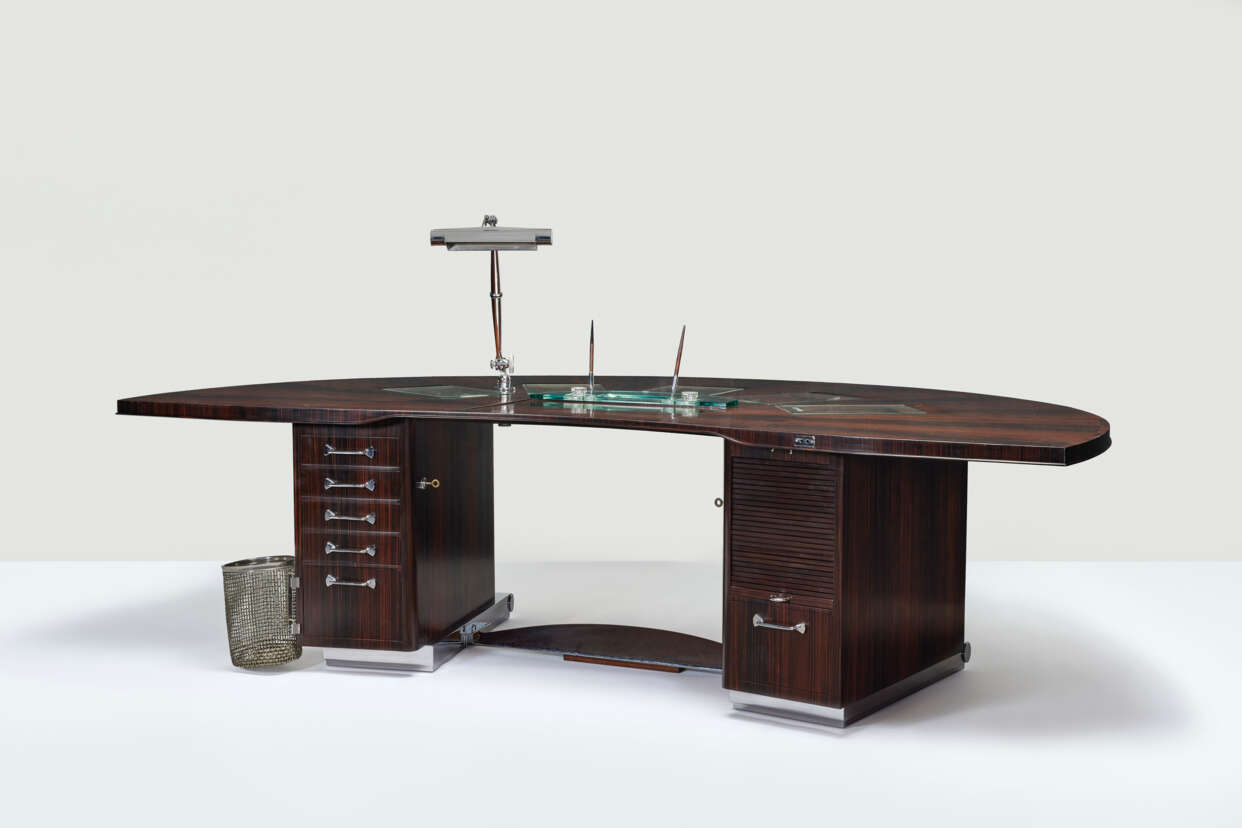 Macassar ebony, oak, yellow peroba, sipo, chrome-plated metal, maillechort and glass ; two original keys, electrical components (desk)