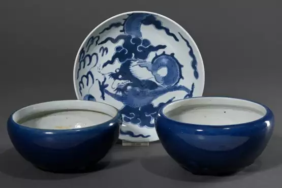 Лот 1324 | 3 Diverse Teile chinesisches Porzellan: Teller mit Blaumalerei Motiv "Wolkendrache" (Ø 20cm) und 2 Schalen mit Powderblue Glasur (H. 8cm, Ø 15cm)